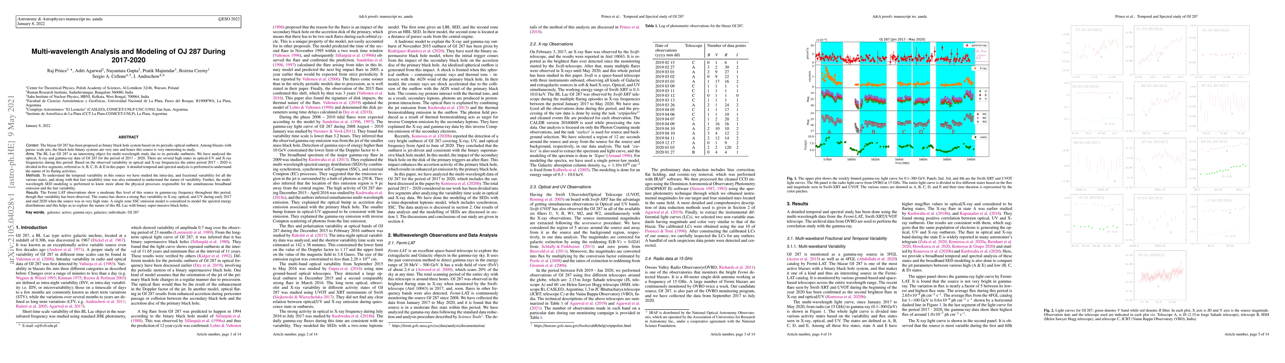 This paper analyzes multi-wavelength data of the blazar OJ 287 from 2017-2020, revealing significant variability in optical, X-ray, and UV frequencies, and employs SED modeling to explore the physical processes behind its emission, supporting the hypothesis of a binary black hole system.
