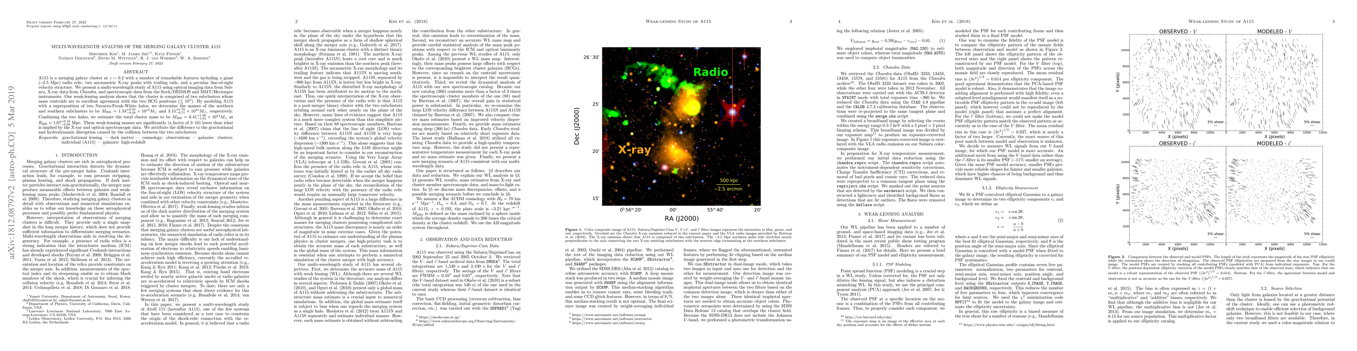 This paper presents a multi-wavelength analysis of the merging galaxy cluster A115, revealing two subclusters with masses of $1.58\times10^{14} \text{M}_{\odot}$ and $3.15\times10^{14} \text{M}_{\odot}$, respectively, and a total mass of $6.41\times10^{14} \text{M}_{\odot}$. The study finds a discrepancy between weak-lensing mass estimates and those from X-ray and optical data, attributed to gravitational and hydrodynamic disruption from the subclusters' collision.