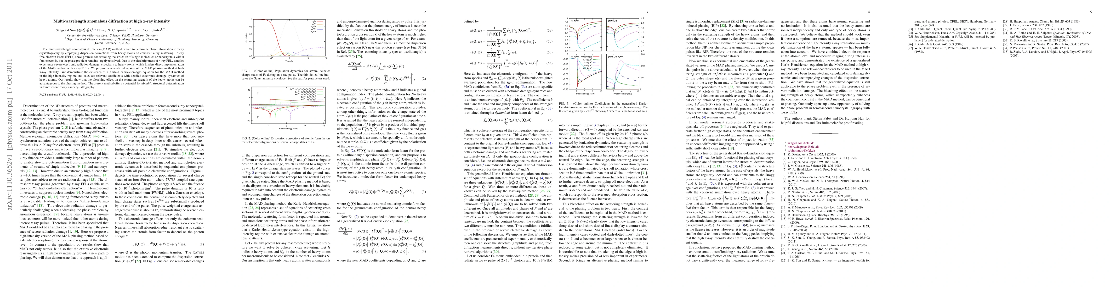 The multi-wavelength anomalous diffraction (MAD) method is used to determine phase information in x-ray crystallography by employing dispersion corrections from heavy atoms on coherent x-ray scattering. X-ray free-electron lasers (FELs) show promise for revealing the structure of single molecules or nanocrystals within femtoseconds, but the phase problem remains largely unsolved. Due to the ultrabrightness of x-ray FEL, samples experience severe electronic radiation damage, especially to heavy atoms, which hinders direct implementation of the MAD method with x-ray FELs. We propose a generalized version of the MAD phasing method at high x-ray intensity. We demonstrate the existence of a Karle--Hendrickson-type equation for the MAD method in the high-intensity regime and calculate relevant coefficients with detailed electronic damage dynamics of heavy atoms. Our results show that the bleaching effect on the scattering strength of the heavy atoms can be advantageous to the phasing method. The present method offers a potential for \textit{ab initio} structural determination in femtosecond x-ray nanocrystallography.