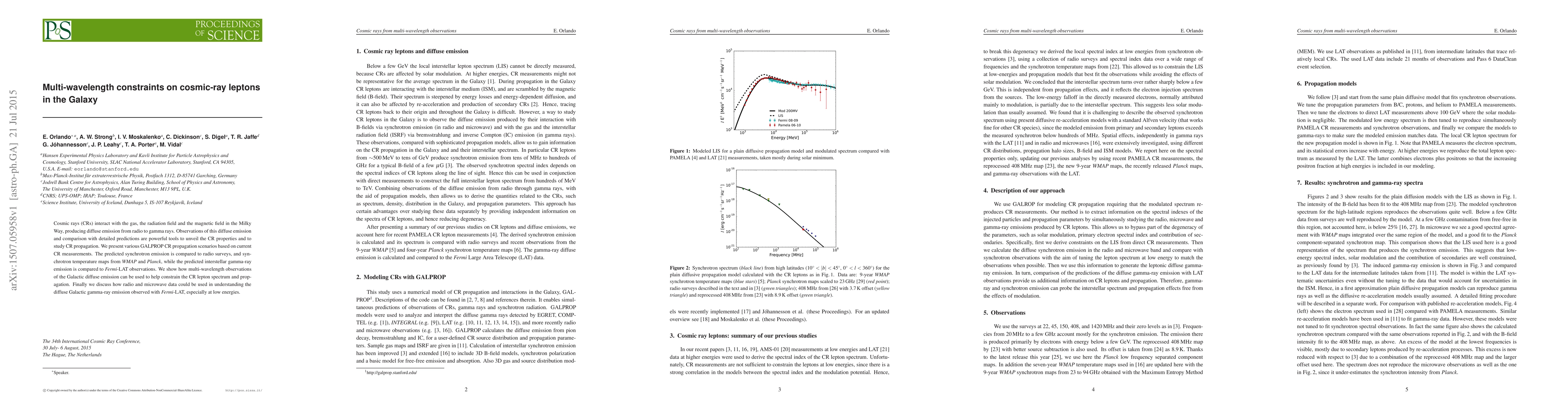 This research uses multi-wavelength observations of Galactic diffuse emission to constrain cosmic ray (CR) lepton properties and propagation in the Milky Way. It compares CR predictions with radio surveys, synchrotron maps from WMAP and Planck, and Fermi-LAT gamma-ray observations, highlighting the role of radio and microwave data in understanding diffuse gamma-ray emission observed with Fermi-LAT, particularly at low energies.
