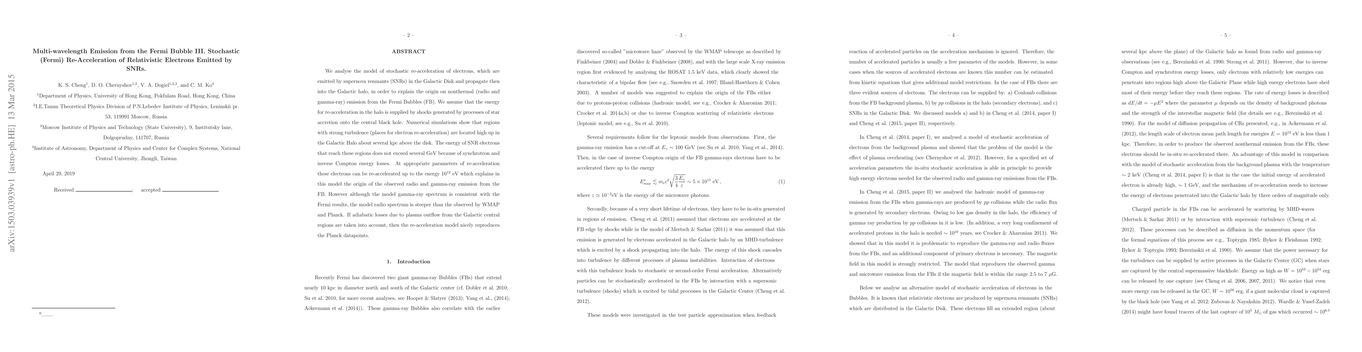 This paper explores a model of stochastic re-acceleration of electrons emitted by supernova remnants, which propagate into the Galactic halo to explain the nonthermal emission from the Fermi Bubbles. The model suggests that electrons can be re-accelerated to ultra-high energies by shocks from star accretion onto the central black hole, explaining the observed radio and gamma-ray emissions.