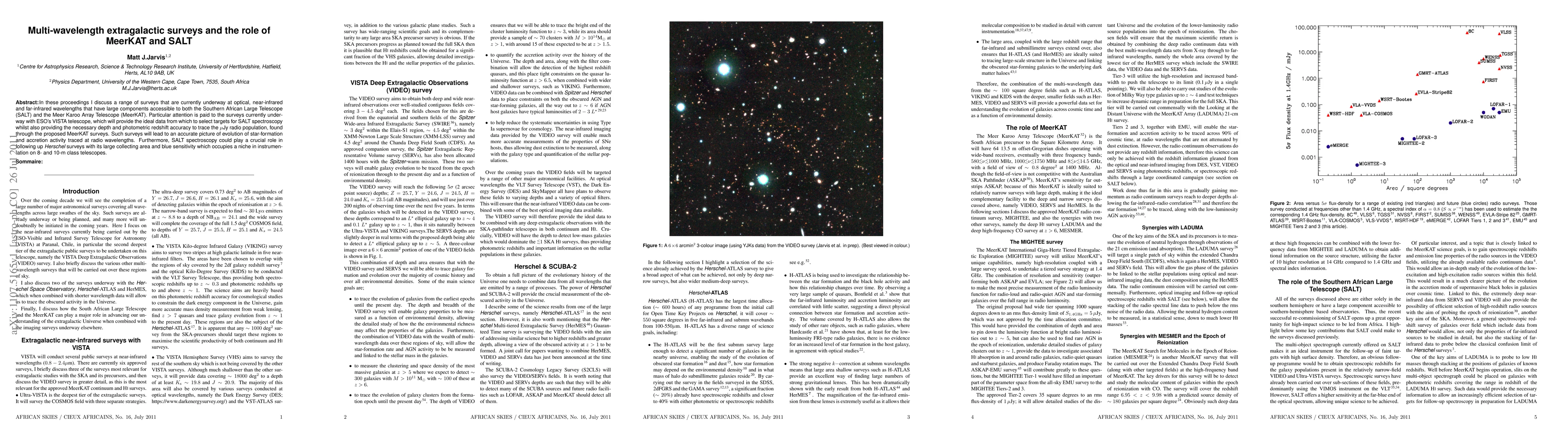 This paper discusses multi-wavelength extragalactic surveys utilizing both MeerKAT and SALT, focusing on ESO's VISTA telescope data to select targets for SALT spectroscopy and trace the uJy radio population from MeerKAT surveys, aiming to understand star-formation and accretion activity evolution. SALT's unique capabilities also complement Herschel surveys.