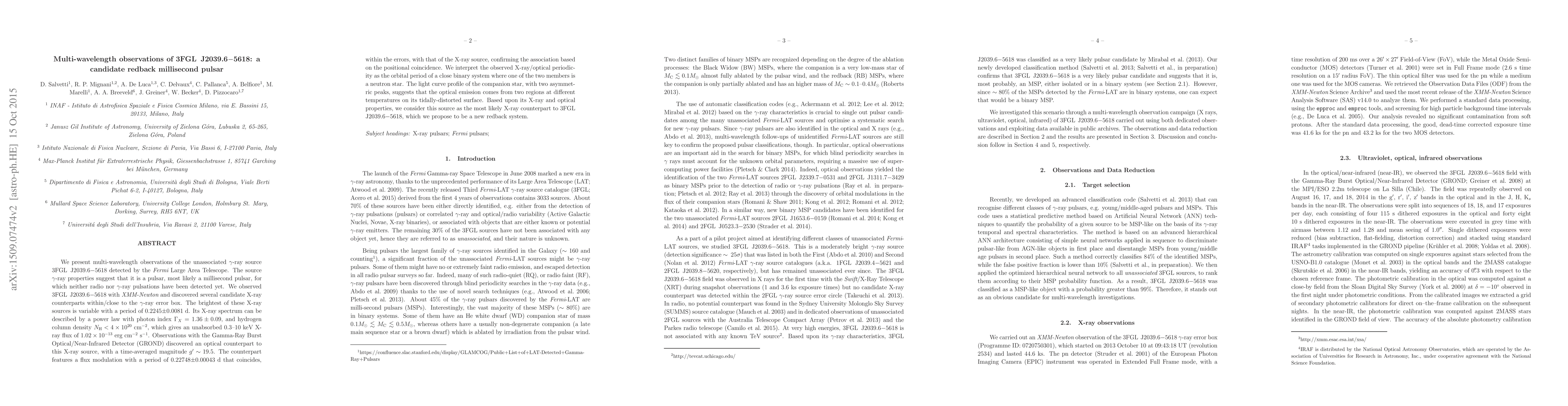 This paper reports multi-wavelength observations identifying a candidate redback millisecond pulsar, 3FGL J2039.6-5618, detected in gamma rays. The X-ray counterpart exhibits variability and periodicity, suggesting it is part of a close binary system with an orbital period of 0.2245 days.