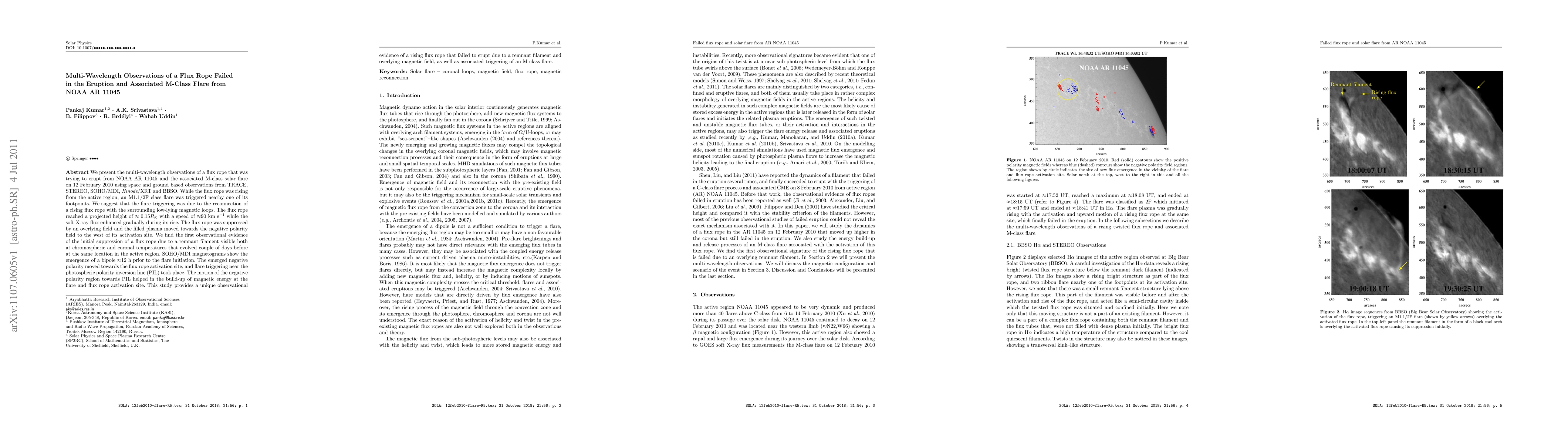 We present the multi-wavelength observations of a flux rope that was trying to erupt from NOAA AR 11045 and the associated M-class solar flare on 12 February 2010 using space and ground based observations from TRACE, STEREO, SOHO/MDI, Hinode/XRT and BBSO. While the flux rope was rising from the active region, an M1.1/2F class flare was triggered nearby one of its footpoints. We suggest that the flare triggering was due to the reconnection of a rising flux rope with the surrounding low-lying magnetic loops. The flux rope reached a projected height of ~0.15 Rs with a speed of ~90 km/s while the soft X-ray flux enhanced gradually during its rise. The flux rope was suppressed by an overlying field and the filled plasma moved towards the negative polarity field to the west of its activation site. We find the first observational evidence of the initial suppression of a flux rope due to a remnant filament visible both at chromospheric and coronal temperatures that evolved couple of days before at the same location in the active region. SOHO/MDI magnetograms show the emergence of a bipole ~12 h prior to the flare initiation. The emerged negative polarity moved towards the flux rope activation site, and flare triggering near the photospheric polarity inversion line (PIL) took place. The motion of the negative polarity region towards PIL helped in the build-up of magnetic energy at the flare and flux rope activation site. This study provides a unique observational evidence of a rising flux rope that failed to erupt due to a remnant filament and overlying magnetic field, as well as associated triggering of an M-class flare.