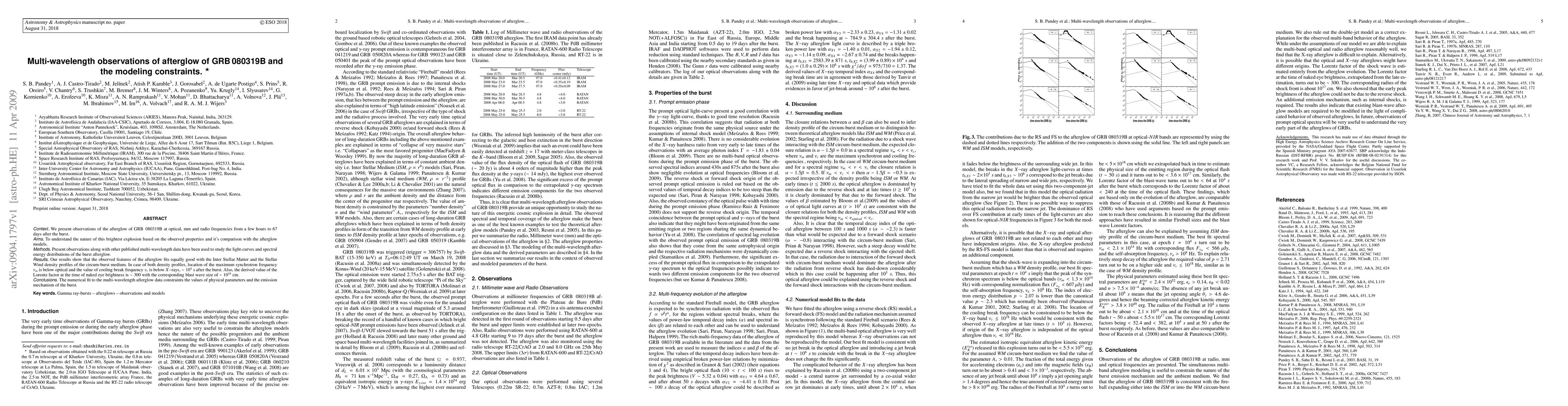 This paper presents multi-wavelength observations of the afterglow of GRB 080319B, finding that its features fit both Interstellar Matter and Stellar Wind density profiles. The study constrains the Lorentz factor and blast wave size, and indicates that the synchrotron frequency maximum is below optical and the cooling break frequency is below X-rays.
