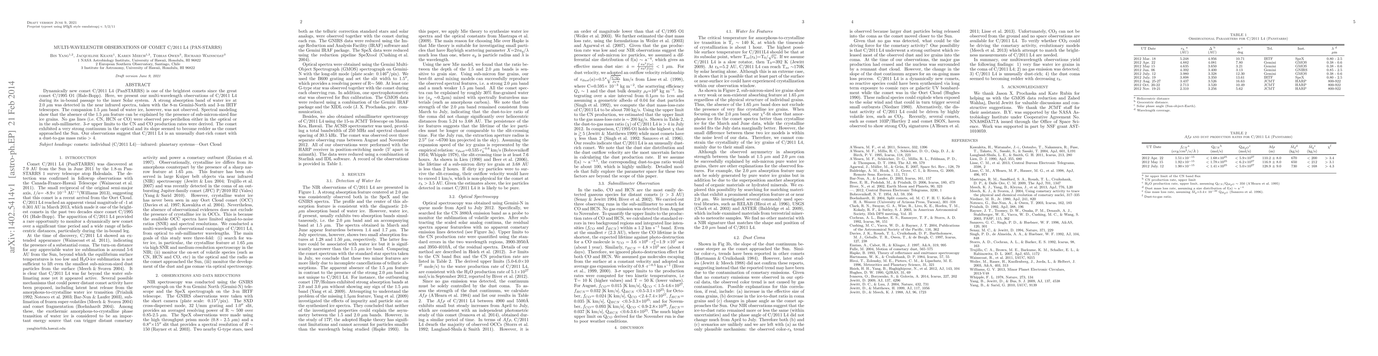 This paper presents multi-wavelength observations of comet C/2011 L4 (Pan-Starrs), revealing a strong water ice absorption band at 2.0 µm but not at 1.5 µm, indicating the presence of fine ice grains. The comet exhibited a strong optical continuum and a high dust-to-gas mass ratio, suggesting it is unusually dust-rich.