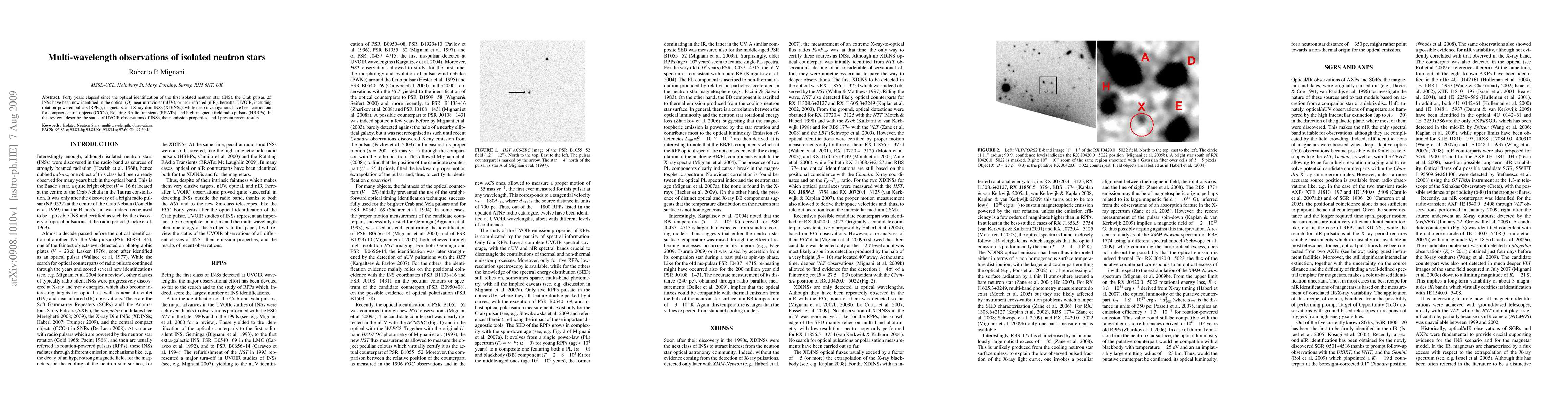 This paper reviews the multi-wavelength observations of 25 identified isolated neutron stars (INSs) across optical, near-ultraviolet, and near-infrared spectra, highlighting their emission properties and recent discoveries in INS classifications such as rotation-powered pulsars and magnetars.