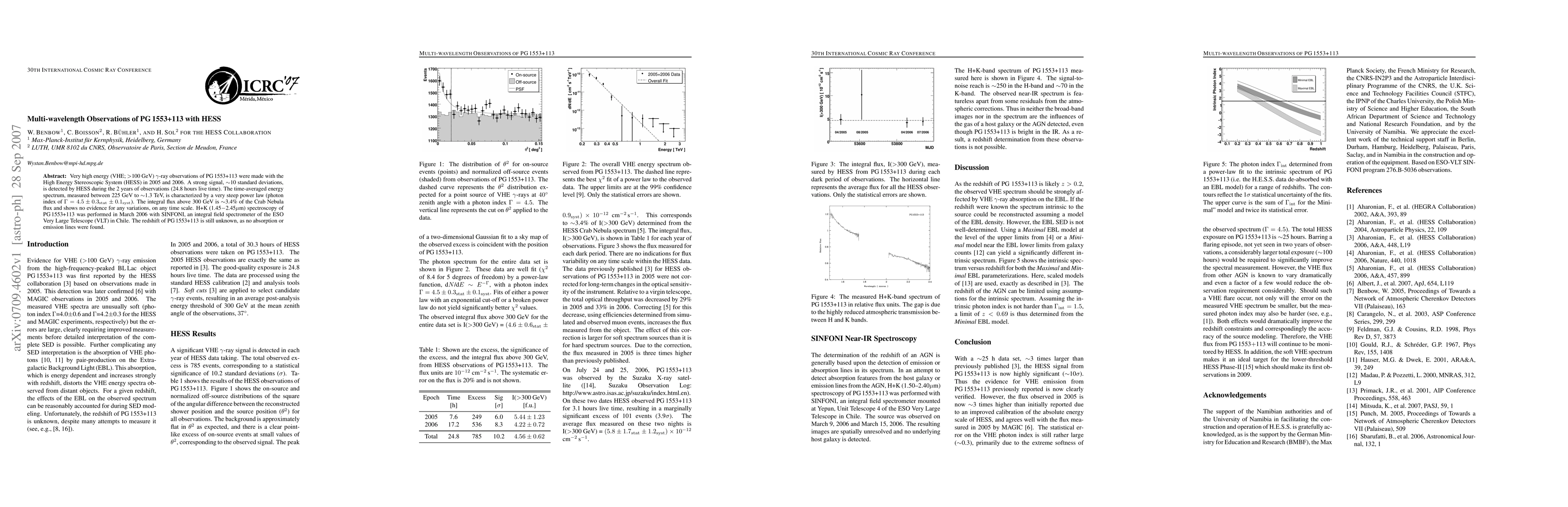 Very high energy (VHE; >100 GeV) gamma-ray observations of PG 1553+113 were made with the High Energy Stereoscopic System (HESS) in 2005 and 2006. A strong signal, ~10 standard deviations, is detected by HESS during the 2 years of observations (24.8 hours live time). The time-averaged energy spectrum, measured between 225 GeV to ~1.3 TeV, is characterized by a very steep power law (photon index of Gamma = (4.5 +- 0.3 {stat} +- 0.1 {syst}). The integral flux above 300 GeV is ~3.4% of the Crab Nebula flux and shows no evidence for any variations, on any time scale. H+K (1.45-2.45 micron) spectroscopy of PG 1553+113 was performed in March 2006 with SINFONI, an integral field spectrometer of the ESO Very Large Telescope (VLT) in Chile. The redshift of PG 1553+113 is still unknown, as no absorption or emission lines were found.