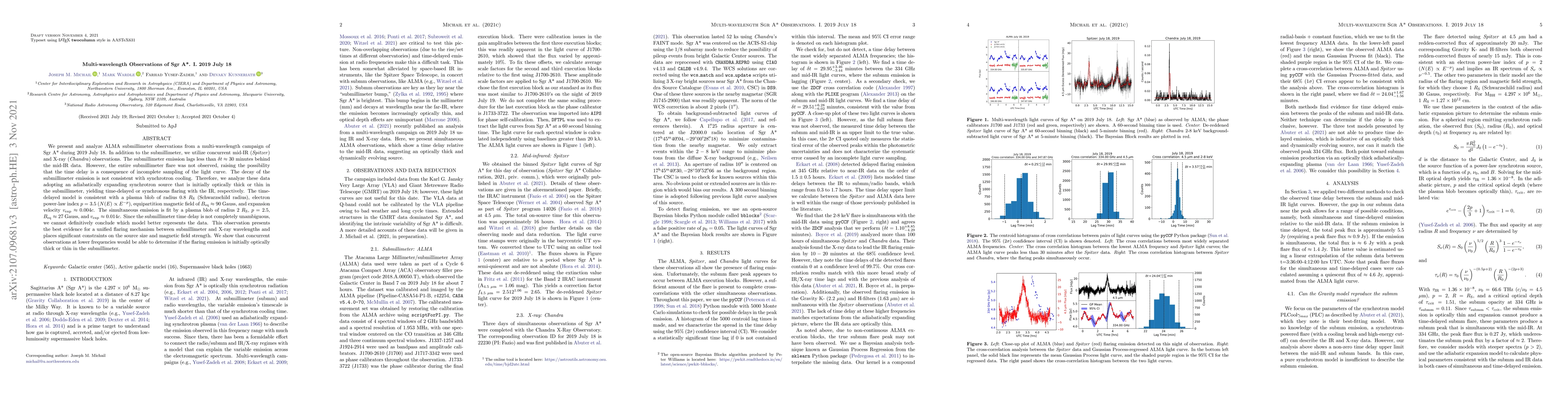 We present and analyze ALMA submillimeter observations from a multi-wavelength campaign of Sgr A* during 18 July 2019. In addition to the submillimeter, we utilize concurrent mid-IR (Spitzer) and X-ray (Chandra) observations. The submillimeter emission lags less than $\delta t\approx30$ minutes behind the mid-IR data. However, the entire submillimeter flare was not observed, raising the possibility that the time delay is a consequence of incomplete sampling of the light curve. The decay of the submillimeter emission is not consistent with synchrotron cooling. Therefore, we analyze these data adopting an adiabatically expanding synchrotron source that is initially optically thick or thin in the submillimeter, yielding time-delayed or synchronous flaring with the IR, respectively. The time-delayed model is consistent with a plasma blob of radius $0.8~R_{\text{S}}$ (Schwarzschild radius), electron power-law index $p=3.5$ ($N(E)\propto E^{-p}$), equipartition magnetic field of $B_{\text{eq}}\approx90$ Gauss, and expansion velocity $v_{\text{exp}}\approx0.004c$. The simultaneous emission is fit by a plasma blob of radius $2~R_{\text{S}}$, $p=2.5$, $B_{\text{eq}}\approx27$ Gauss, and $v_{\text{exp}}\approx0.014c$. Since the submillimeter time delay is not completely unambiguous, we cannot definitively conclude which model better represents the data. This observation presents the best evidence for a unified flaring mechanism between submillimeter and X-ray wavelengths and places significant constraints on the source size and magnetic field strength. We show that concurrent observations at lower frequencies would be able to determine if the flaring emission is initially optically thick or thin in the submillimeter.