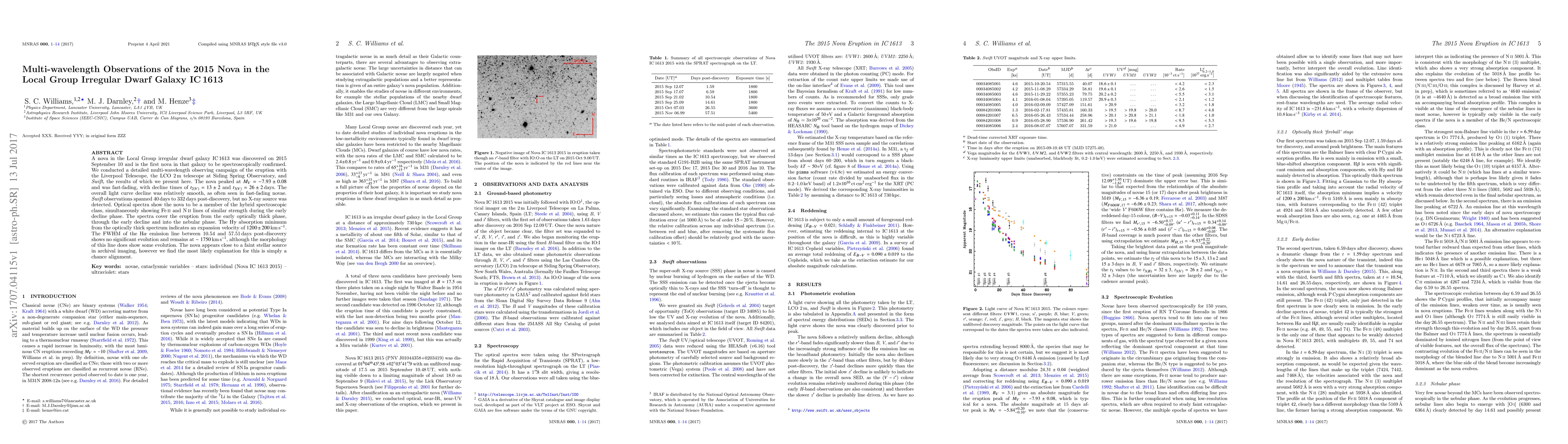 The 2015 nova in IC 1613 was spectroscopically confirmed, making it the first nova in this Local Group dwarf galaxy. Multi-wavelength observations using Liverpool Telescope, LCO 2m, and Swift revealed a fast-fading nova peaking at MV=-7.93±0.08, with decline times t2(V)=13±2 days and t3(V)=26±2 days. No X-ray source was detected post-eruption. The nova was classified as hybrid, displaying Fe II and N II lines. Spectra showed an initial expansion velocity of 1200±200 km s^-1 and a consistent Hα FWHM of ~1750 km s^-1, with some line morphology evolution. The nova appeared near a faint stellar source in archival images, but this was likely a chance alignment.