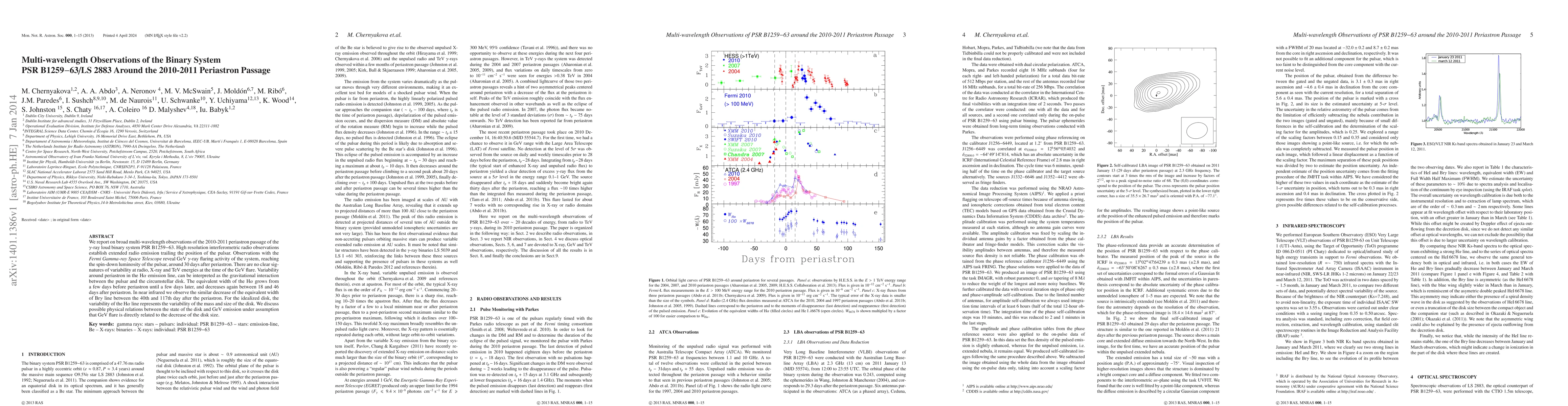 We report on broad multi-wavelength observations of the 2010-2011 periastron passage of the gamma-ray loud binary system PSR B1259-63. High resolution interferometric radio observations establish extended radio emission trailing the position of the pulsar. Observations with the Fermi Gamma-ray Space Telescope reveal GeV gamma-ray flaring activity of the system, reaching the spin-down luminosity of the pulsar, around 30 days after periastron. There are no clear signatures of variability at radio, X-ray and TeV energies at the time of the GeV flare. Variability around periastron in the H$\alpha$ emission line, can be interpreted as the gravitational interaction between the pulsar and the circumstellar disk. The equivalent width of the H$\alpha$ grows from a few days before periastron until a few days later, and decreases again between 18 and 46 days after periastron. In near infrared we observe the similar decrease of the equivalent width of Br$\gamma$ line between the 40th and 117th day after the periastron. For the idealized disk, the variability of the H$\alpha$ line represents the variability of the mass and size of the disk. We discuss possible physical relations between the state of the disk and GeV emission under assumption that GeV flare is directly related to the decrease of the disk size.