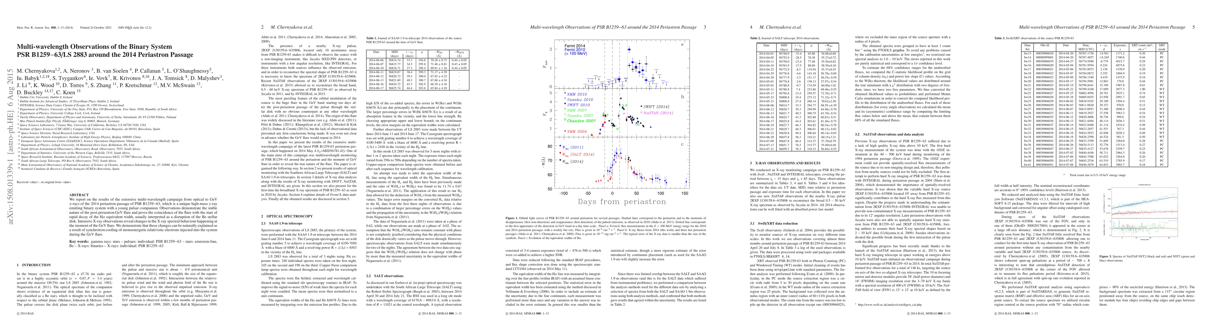 We report on the results of the extensive multi-wavelength campaign from optical to GeV gamma-rays of the 2014 periastron passage of PSR B1259-63, which is a unique high-mass gamma-ray emitting binary system with a young pulsar companion. Observations demonstrate the stable nature of the post-periastron GeV flare and prove the coincidence of the flare with the start of rapid decay of the H$\alpha$ equivalent width, usually interpreted as a disruption of the Be stellar disk. Intensive X-ray observations reveal changes in the X-ray spectral behaviour happening at the moment of the GeV flare. We demonstrate that these changes can be naturally explained as a result of synchrotron cooling of monoenergetic relativistic electrons injected into the system during the GeV flare.