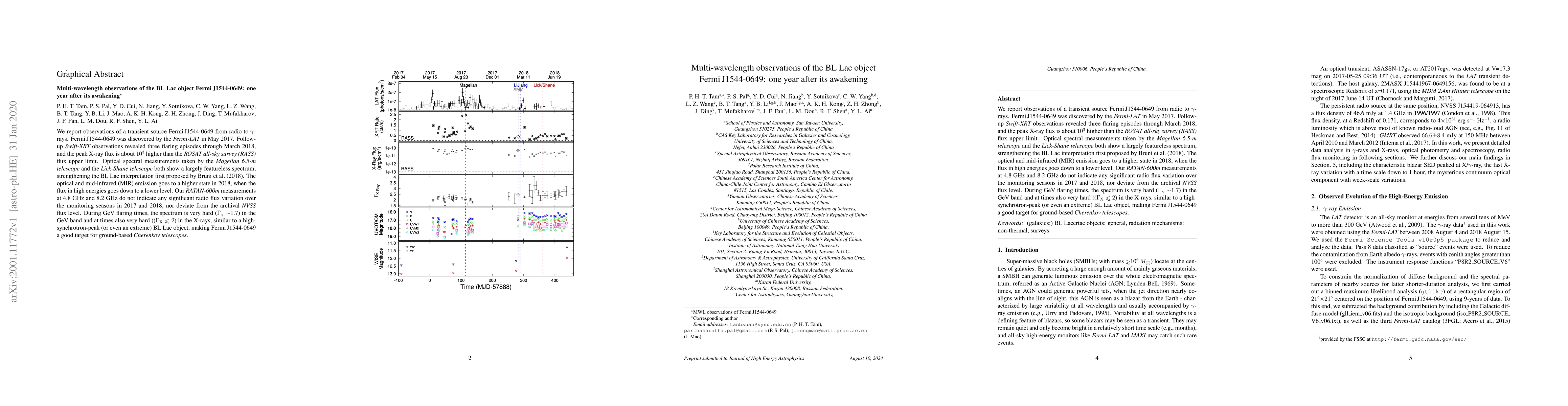 We report observations of a transient source \fermi\ from radio to \grs. \fermi\ was discovered by the {\it Fermi-LAT} in May 2017. Follow-up {\it Swift-XRT} observations revealed three flaring episodes through March 2018, and the peak X-ray flux is about $10^3$ higher than the {\it ROSAT all-sky survey (RASS)} flux upper limit. Optical spectral measurements taken by the {\it Magellan 6.5-m telescope} and the {\it Lick-Shane telescope} both show a largely featureless spectrum, strengthening the BL Lac interpretation first proposed by \citet{Bruni18}. The optical and mid-infrared (MIR) emission goes to a higher state in 2018, when the flux in high energies goes down to a lower level. Our {\it RATAN-600m} measurements at 4.8~GHz and 8.2~GHz do not indicate any significant radio flux variation over the monitoring seasons in 2017 and 2018, nor deviate from the archival {\it NVSS} flux level. During GeV flaring times, the spectrum is very hard ($\Gamma_\gamma\sim$1.7) in the GeV band and at times also very hard (($\Gamma_{\rm X}\lesssim2$) in the X-rays, similar to a high-synchrotron-peak (or even an extreme) BL Lac object, making \fermi\ a good target for ground-based {\it Cherenkov telescopes}.