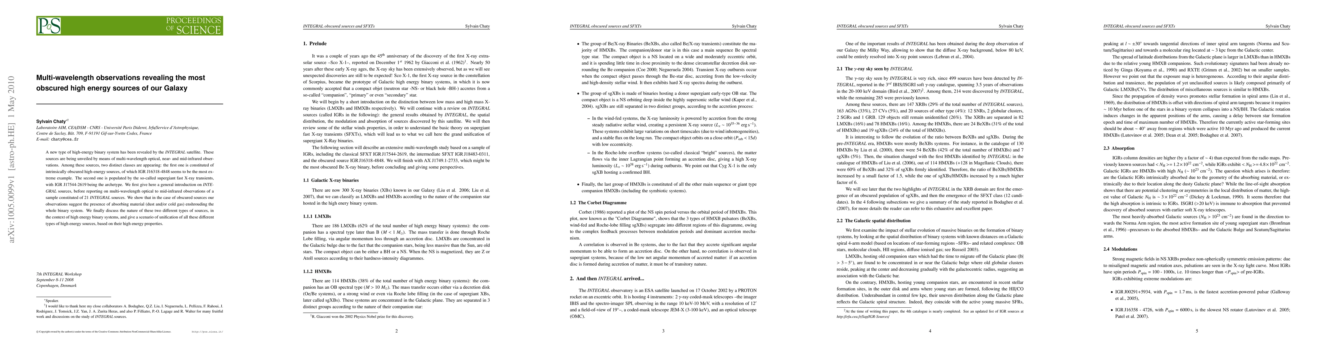 A new type of high-energy binary system has been revealed by the INTEGRAL satellite. These sources are being unveiled by means of multi-wavelength optical, near- and mid-infrared observations. Among these sources, two distinct classes are appearing: the first one is constituted of intrinsically obscured high-energy sources, of which IGR J16318-4848 seems to be the most extreme example. The second one is populated by the so-called supergiant fast X-ray transients, with IGR J17544-2619 being the archetype. We first give here a general introduction on INTEGRAL sources, before reporting on multi-wavelength optical to mid-infrared observations of a sample constituted of 21 INTEGRAL sources. We show that in the case of obscured sources our observations suggest the presence of absorbing material (dust and/or cold gas) enshrouding the whole binary system. We finally discuss the nature of these two different types of sources, in the context of high energy binary systems, and give a scenario of unification of all these different types of high energy sources, based on their high energy properties.