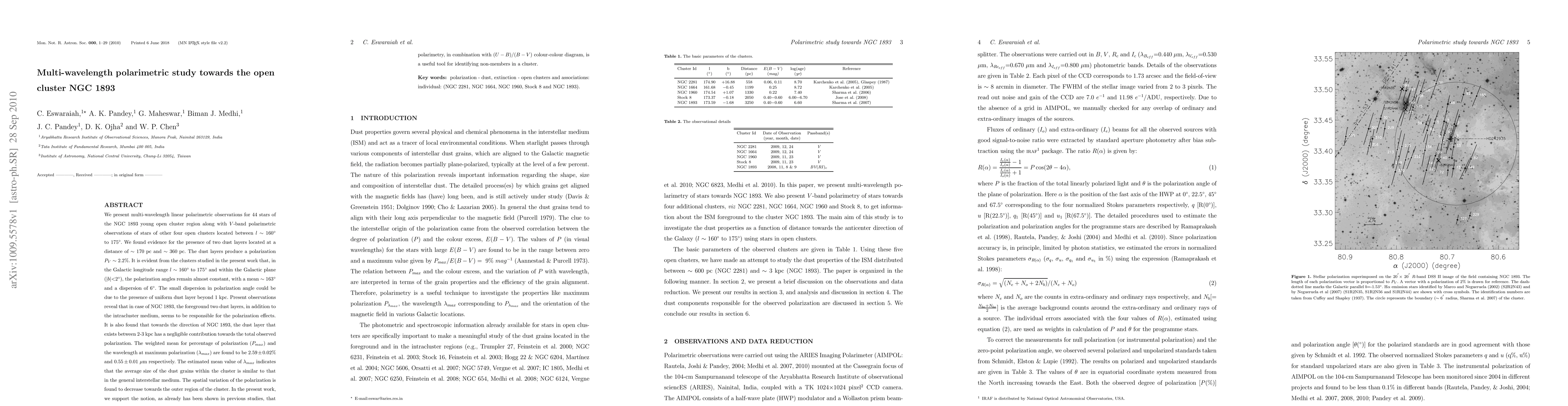 A multi-wavelength study of 44 stars in NGC 1893 found evidence of two dust layers at 170pc and 360pc, producing a polarization of 2.2% with a mean angle of 163 degrees.