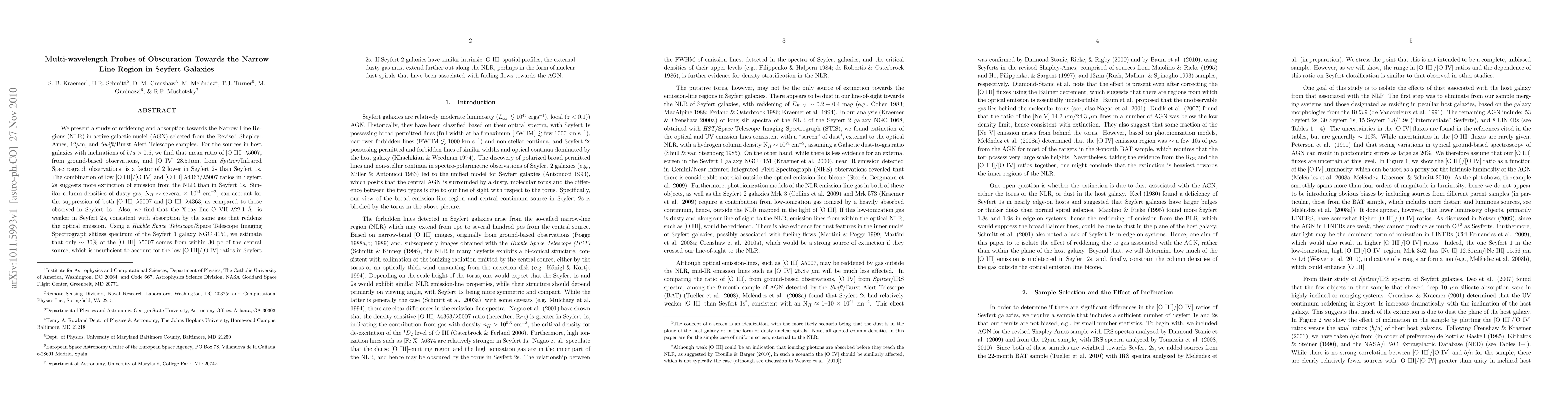 We present a study of reddening and absorption towards the Narrow Line Regions (NLR) in active galactic nuclei (AGN) selected from the Revised Shapley-Ames, 12mu, and Swift/Burst Alert Telescope samples. For the sources in host galaxies with inclinations of b/a > 0.5, we find that mean ratio of [O III] 5007A, from ground-based observations, and [O IV] 28.59mu, from Spitzer/Infrared Spectrograph observations, is a factor of 2 lower in Seyfert 2s than Seyfert 1s. The combination of low [O III]/[O IV] and [O III] 4363/5007 ratios in Seyfert 2s suggests more extinction of emission from the NLR than in Seyfert 1s. Similar column densities of dusty gas, NH ~ several X 10^21 cm^-2, can account for the suppression of both [O III] 5007A and [O III] 4363A, as compared to those observed in Seyfert 1s. Also, we find that the X-ray line OVII 22.1A is weaker in Seyfert 2s, consistent with absorption by the same gas that reddens the optical emission. Using a Hubble Space Telescope/Space Telescope Imaging Spectrograph slitless spectrum of the Seyfert 1 galaxy NGC 4151, we estimate that only ~ 30% of the [O III] 5007A comes from within 30 pc of the central source, which is insufficient to account for the low [O III]/[OIV] ratios in Seyfert 2s. If Seyfert 2 galaxies have similar intrinsic [OIII] spatial profiles, the external dusty gas must extend further out along the NLR, perhaps in the form of nuclear dust spirals that have been associated with fueling flows towards the AGN.