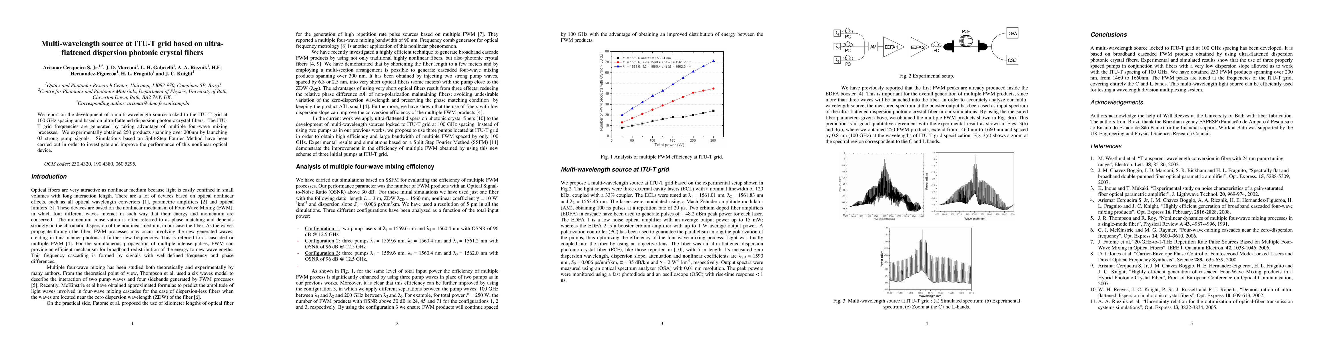 We report on the development of a multi-wavelength source locked to the ITU-T grid at 100 GHz spacing and based on ultra-flattened dispersion photonic crystal fibers. The ITU-T grid frequencies are generated by taking advantage of multiple four-wave mixing processes. We experimentally obtained 250 products spanning over 200nm by launching 03 strong pump signals. Simulations based on Split-Step Fourier Method have been carried out in order to investigate and improve the performance of this nonlinear optical device.