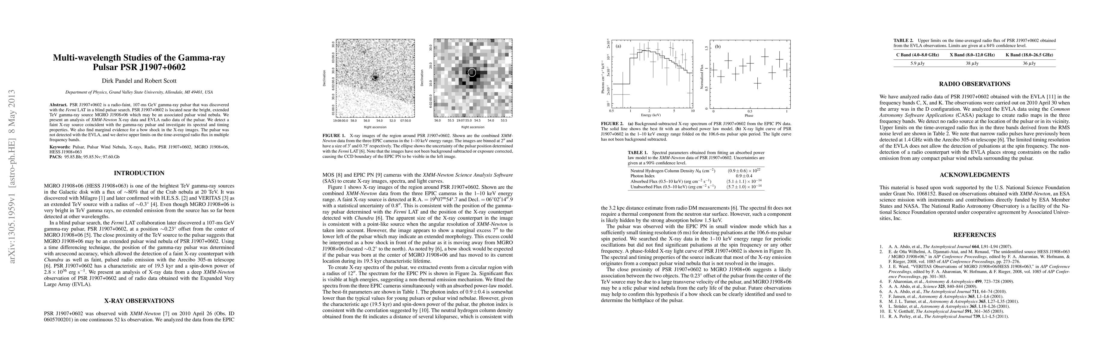 This paper reports the detection of a faint X-ray source coincident with the GeV gamma-ray pulsar PSR J1907+0602 using XMM-Newton, while no radio detection was made with EVLA, providing upper limits on its radio flux and evidence for a potential X-ray bow shock.