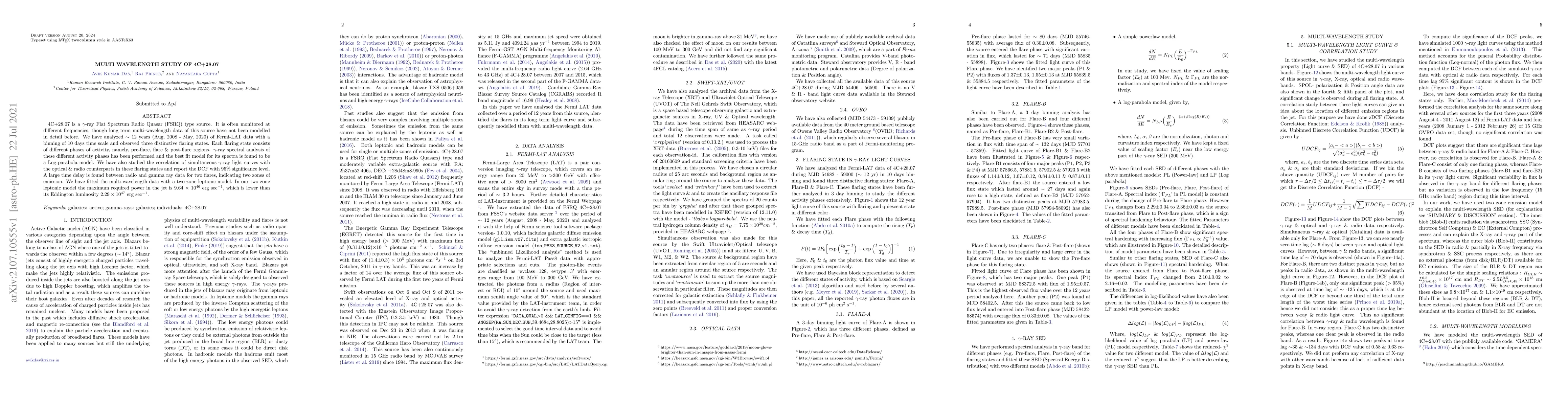 This study analyzes 12 years of Fermi-LAT data for the FSRQ 4C+28.07, identifying three distinct flaring states and employing a Log-parabola model for gamma-ray spectral analysis. A two-zone leptonic model is used to fit the multi-wavelength data, revealing significant time delays between radio and gamma-ray emissions, suggesting separate emission zones.