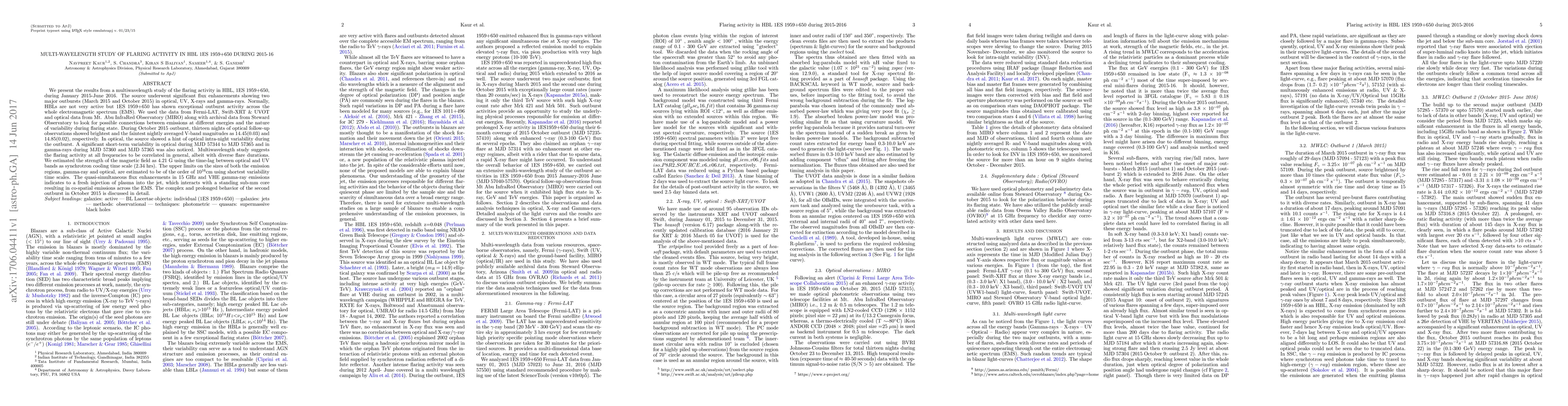 This paper reports a multiwavelength study of the High-Frequency-Peaked BL Lac object 1ES 1959+650, revealing significant flux enhancements during two major outbursts in 2015. The study found correlated flaring activity across optical, UV, X-ray, and gamma-ray bands, with the magnetic field strength estimated at 4.21 G.