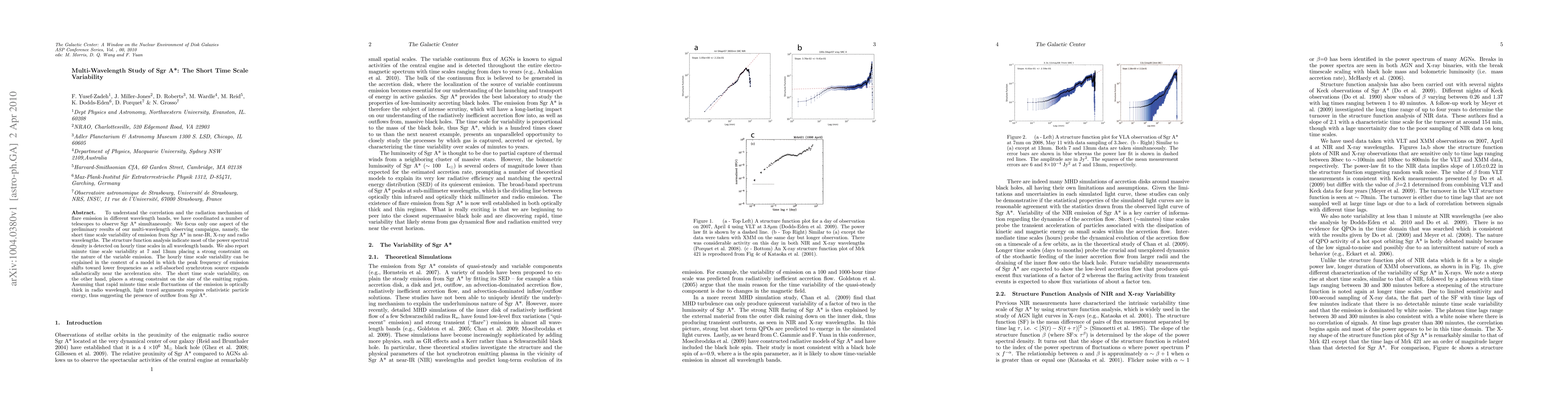 To understand the correlation and the radiation mechanism of flare emission in different wavelength bands, we have coordinated a number of telescopes to observe SgrA* simultaneously. We focus only on one aspect of the preliminary results of our multi-wavelength observing campaigns, namely, the short time scale variability of emission from SgrA* in near-IR, X-ray and radio wavelengths. The structure function analysis indicate most of the power spectral density is detected on hourly time scales in all wavelength bands. We also report minute time scale variability at 7 and 13mm placing a strong constraint on the nature of the variable emission. The hourly time scale variability can be explained in the context of a model in which the peak frequency of emission shifts toward lower frequencies as a self-absorbed synchrotron source expands adiabatically near the acceleration site. The short time scale variability, on the other hand, places a strong constraint on the size of the emitting region. Assuming that rapid minute time scale fluctuations of the emission is optically thick in radio wavelength, light travel arguments requires relativistic particle energy, thus suggesting the presence of outflow from SgrA*.