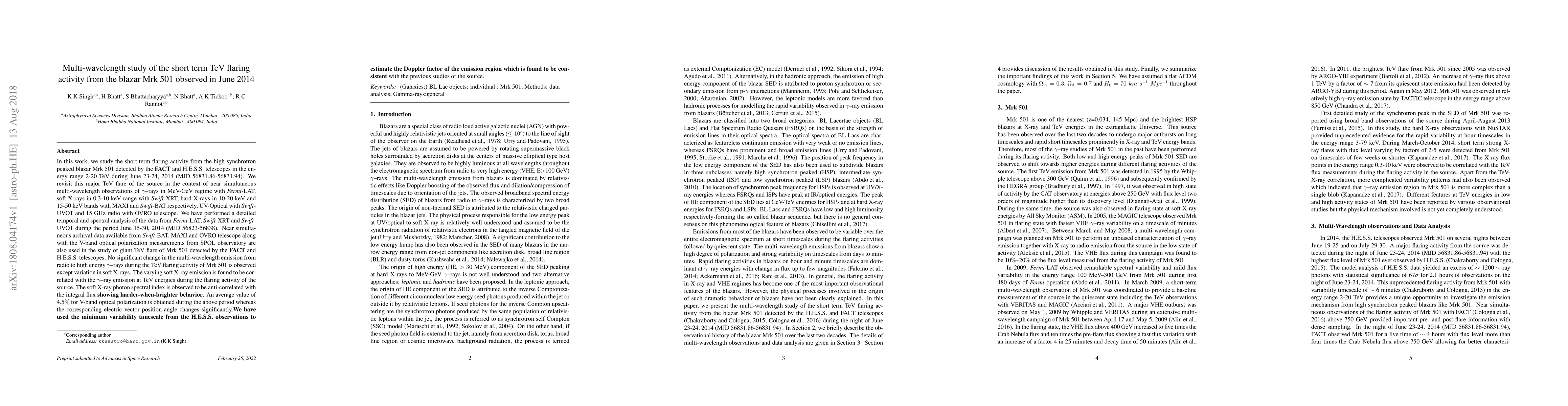 This study analyzes the short-term TeV flaring activity from the blazar Mrk 501 in June 2014 using multi-wavelength observations. The analysis reveals no significant changes in radio to high-energy gamma-ray emissions except for variations in soft X-rays, which correlate with TeV gamma-ray activity, showing a "harder-when-brighter" behavior.