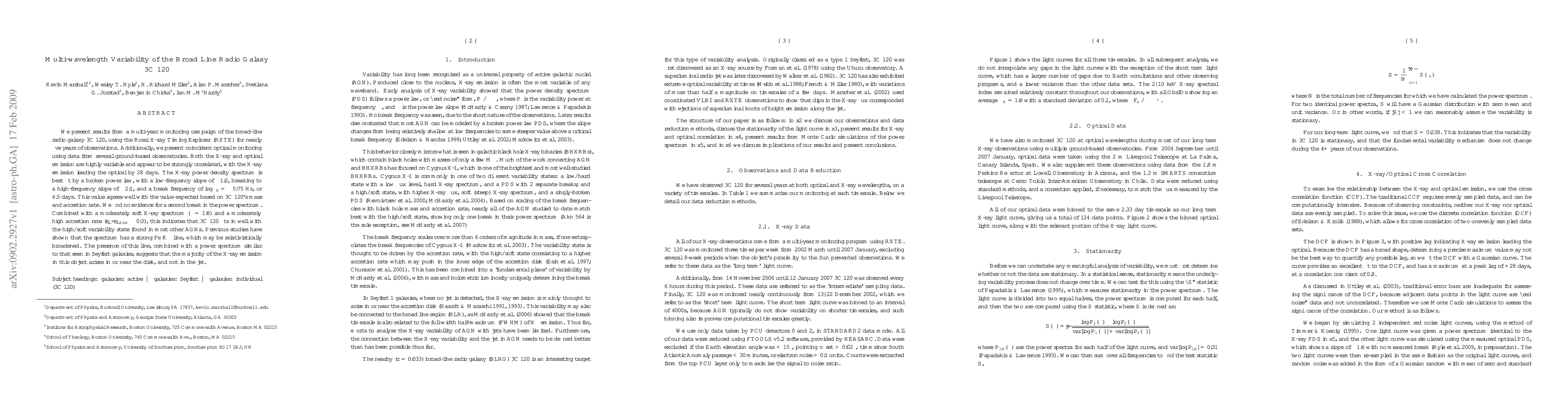 The research utilized a multi-year monitoring campaign of the broad-line radio galaxy 3C 120 with the Rossi X-ray Timing Explorer (RXTE) for nearly five years, supplemented by ground-based observatories for optical data. The X-ray and optical light curves were analyzed for variability and correlation, with power density spectrum (PDS) fitting to understand the variability patterns.