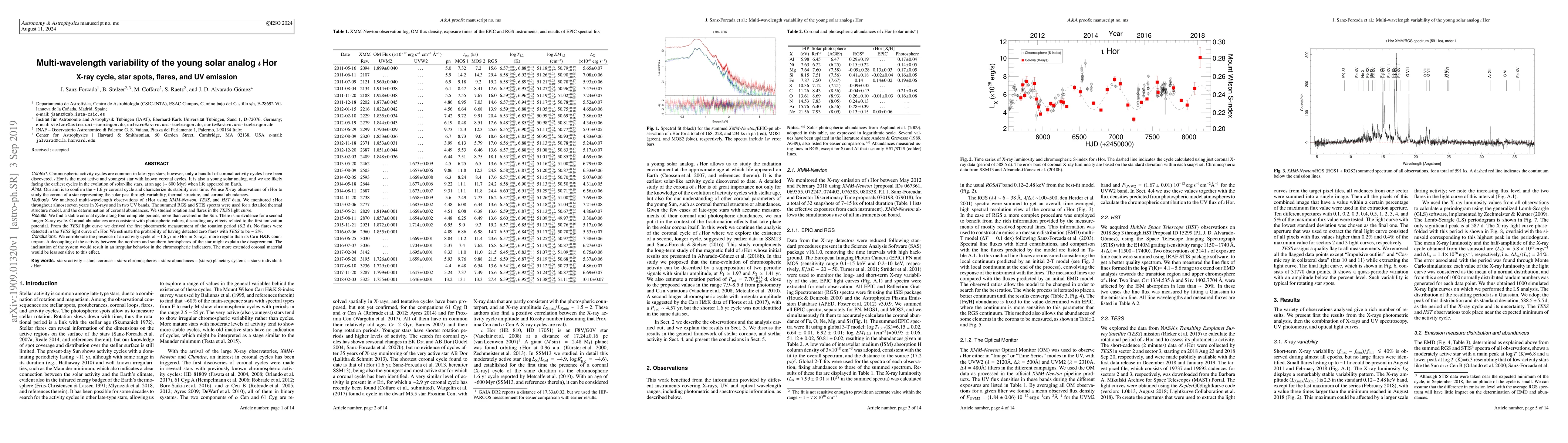 The study of iota Hor, a young solar analog, confirms a stable 1.6-year coronal cycle with no evidence for multiple cycles, similar to the Sun's X-ray pattern. The research provides insights into the star's thermal structure, rotation period, and UV emission patterns.