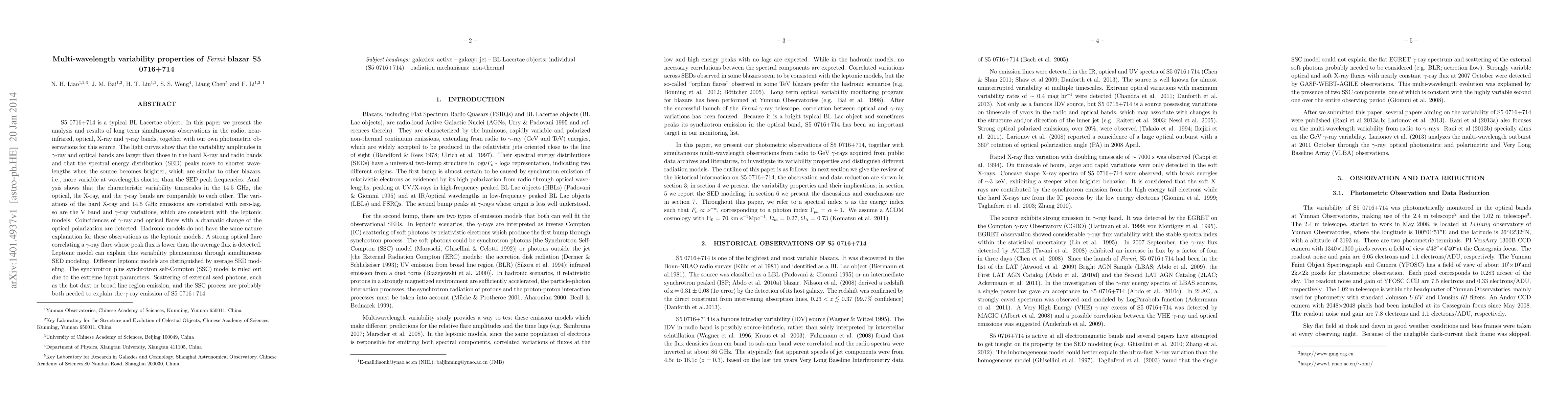 S5 0716+714 is a typical BL Lacertae object. In this paper we present the analysis and results of long term simultaneous observations in the radio, near-infrared, optical, X-ray and $\gamma$-ray bands, together with our own photometric observations for this source. The light curves show that the variability amplitudes in $\gamma$-ray and optical bands are larger than those in the hard X-ray and radio bands and that the spectral energy distribution (SED) peaks move to shorter wavelengths when the source becomes brighter, which are similar to other blazars, i.e., more variable at wavelengths shorter than the SED peak frequencies. Analysis shows that the characteristic variability timescales in the 14.5 GHz, the optical, the X-ray, and the $\gamma$-ray bands are comparable to each other. The variations of the hard X-ray and 14.5 GHz emissions are correlated with zero-lag, so are the V band and $\gamma$-ray variations, which are consistent with the leptonic models. Coincidences of $\gamma$-ray and optical flares with a dramatic change of the optical polarization are detected. Hadronic models do not have the same nature explanation for these observations as the leptonic models. A strong optical flare correlating a $\gamma$-ray flare whose peak flux is lower than the average flux is detected. Leptonic model can explain this variability phenomenon through simultaneous SED modeling. Different leptonic models are distinguished by average SED modeling. The synchrotron plus synchrotron self-Compton (SSC) model is ruled out due to the extreme input parameters. Scattering of external seed photons, such as the hot dust or broad line region emission, and the SSC process are probably both needed to explain the $\gamma$-ray emission of S5 0716+714.