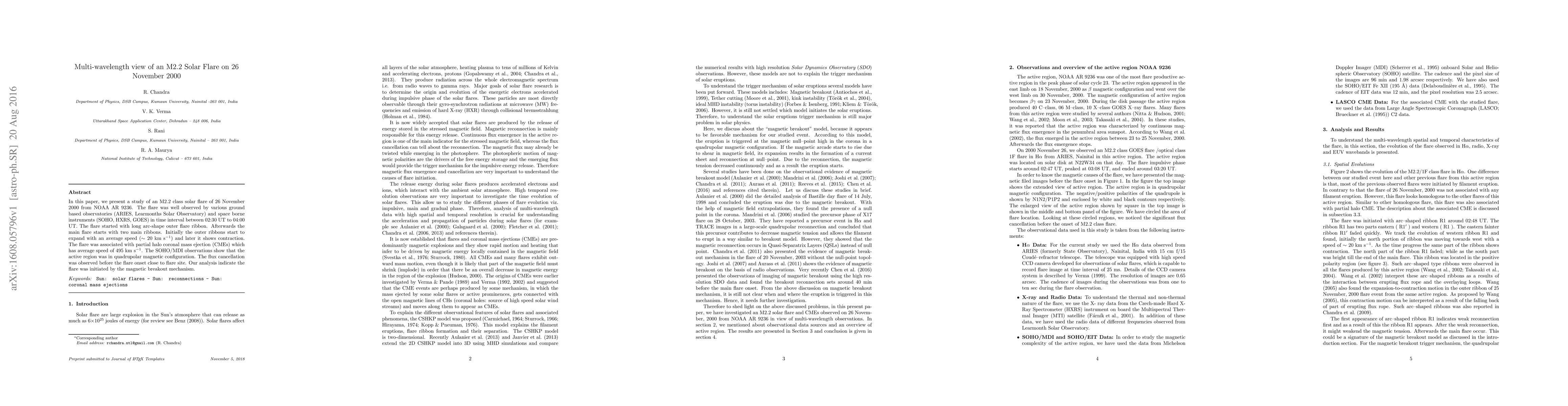In this paper, we present a study of an M2.2 class solar flare of 26 November 2000 from NOAA AR 9236. The flare was well observed by various ground based observatories (ARIES, Learmonths Solar Observatory) and space borne instruments (SOHO, HXRS, GOES) in time interval between 02:30 UT to 04:00 UT. The flare started with long arc-shape outer flare ribbon. Afterwards the main flare starts with two main ribbons. Initially the outer ribbons start to expand with an average speed ($\sim$ 20 km s$^{-1}$) and later it shows contraction. The flare was associated with partial halo coronal mass ejection (CMEs) which has average speed of 495 km s$^{-1}$. The SOHO/MDI observations show that the active region was in quadrupolar magnetic configuration. The flux cancellation was observed before the flare onset close to flare site. Our analysis indicate the flare was initiated by the magnetic breakout mechanism.