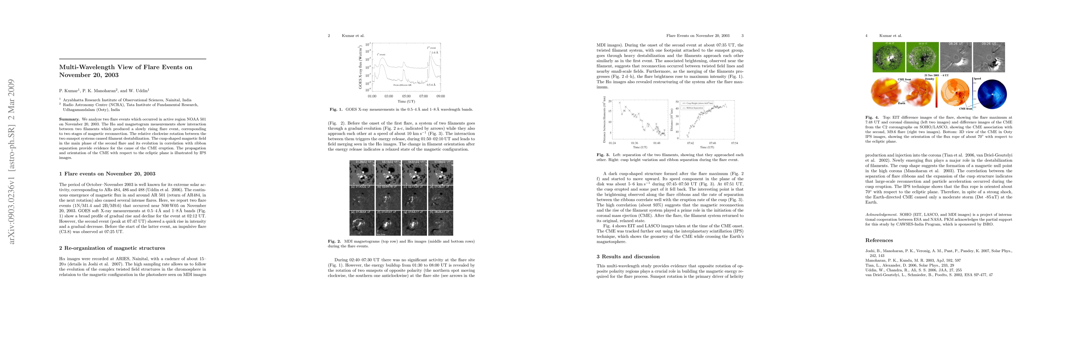 This study analyzes two flare events on November 20, 2003, in active region NOAA 501, revealing interactions between filaments leading to magnetic reconnection and a CME eruption, with IPS images showing the CME's propagation relative to the ecliptic plane.