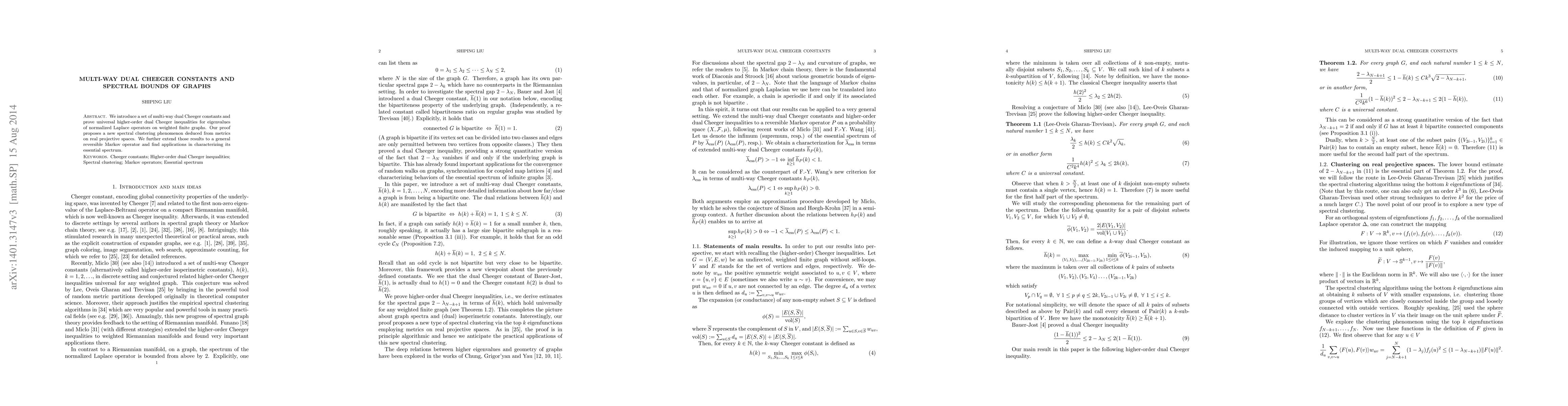 We introduce a set of multi-way dual Cheeger constants and prove universal higher-order dual Cheeger inequalities for eigenvalues of normalized Laplace operators on weighted finite graphs. Our proof proposes a new spectral clustering phenomenon deduced from metrics on real projective spaces. We further extend those results to a general reversible Markov operator and find applications in characterizing its essential spectrum.