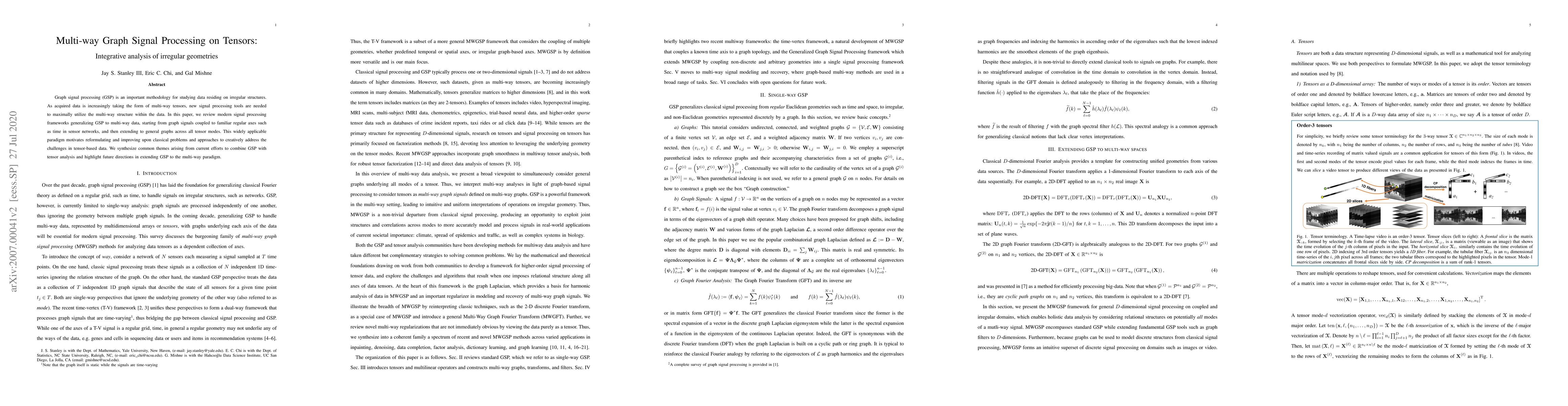 This paper reviews modern frameworks for graph signal processing (GSP) applied to multi-way tensors, aiming to leverage the multi-dimensional structure of data on irregular geometries. It synthesizes current efforts to integrate GSP with tensor analysis and outlines future research directions.