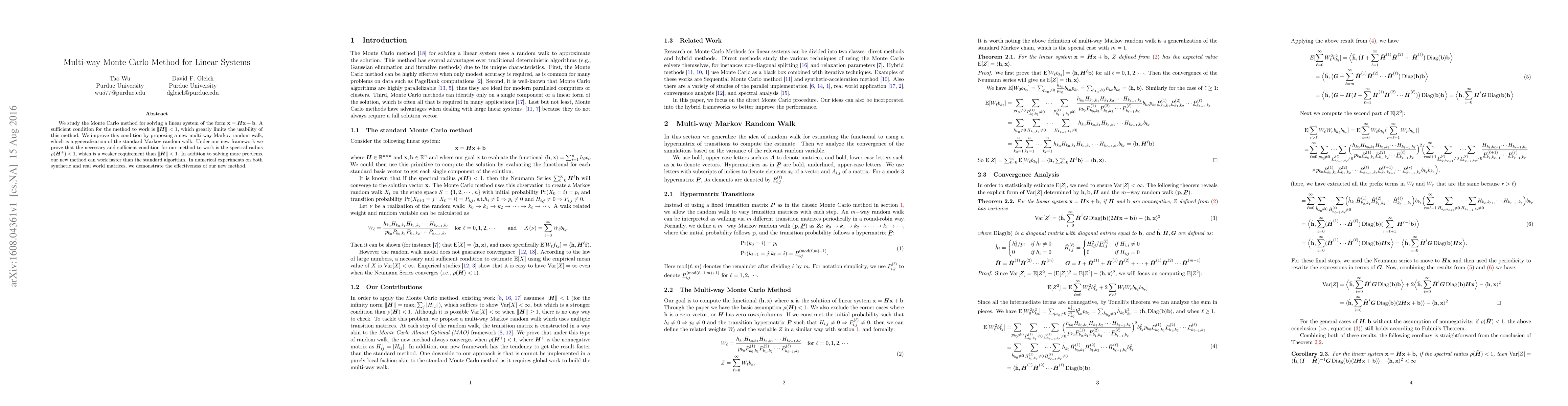A new multi-way Markov random walk method improves upon the existing Monte Carlo method for solving linear systems, requiring a weaker spectral radius condition of less than 1 instead of less than 1, making it more viable for practical use.