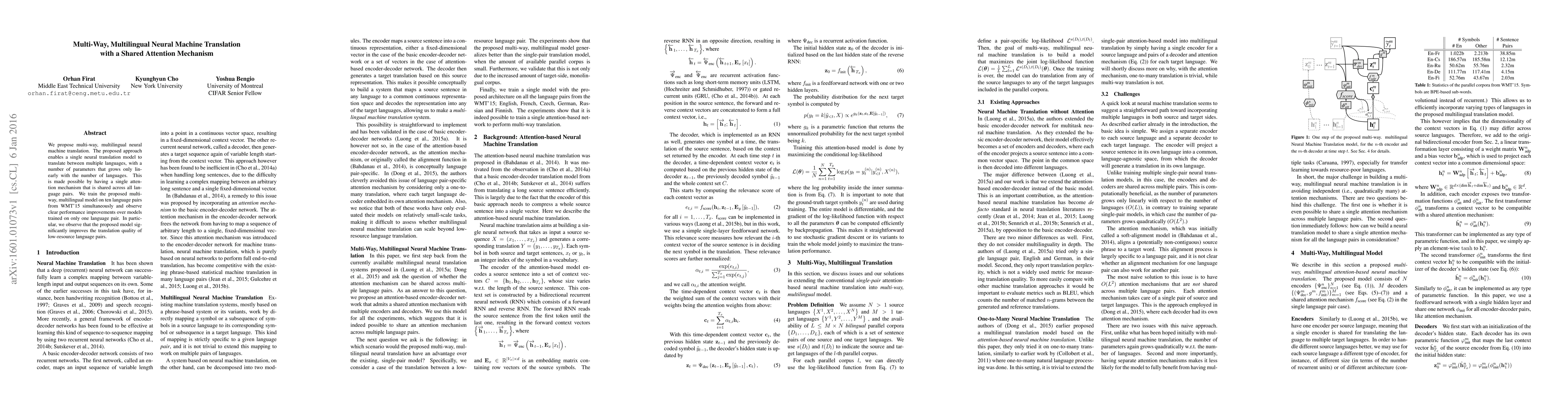 This research proposes a scalable, multi-way, multilingual neural machine translation model that shares a single attention mechanism across language pairs, significantly reducing parameter growth. The model demonstrates improved translation quality, especially for low-resource languages, when trained on multiple language pairs simultaneously.