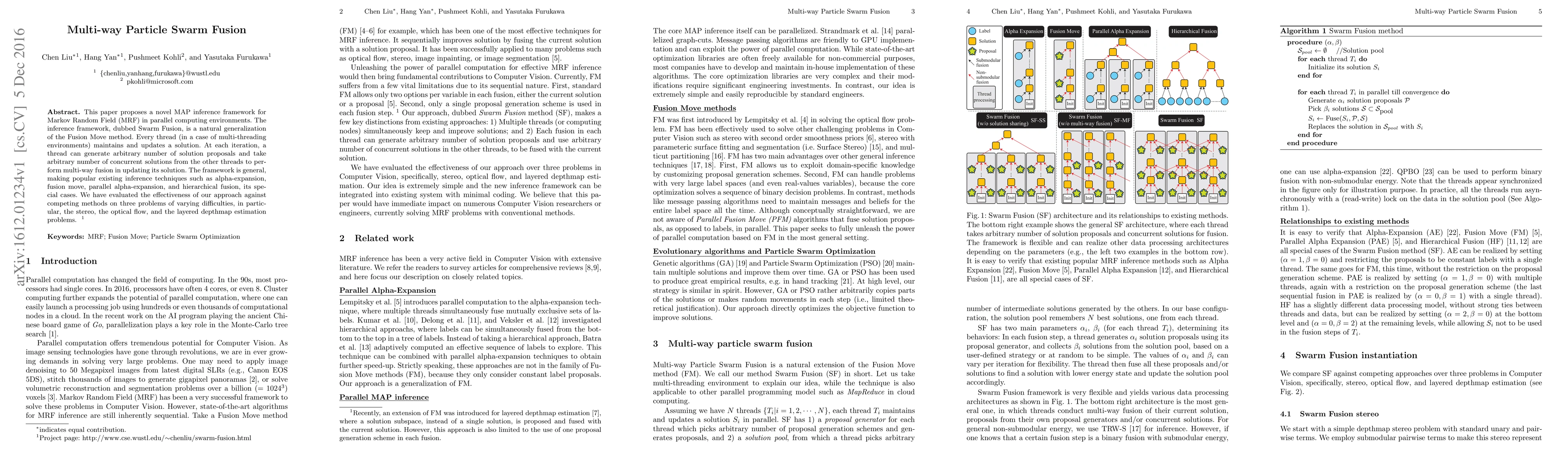 This paper proposes a novel MAP inference framework for Markov Random Field (MRF) in parallel computing environments. The inference framework, dubbed Swarm Fusion, is a natural generalization of the Fusion Move method. Every thread (in a case of multi-threading environments) maintains and updates a solution. At each iteration, a thread can generate arbitrary number of solution proposals and take arbitrary number of concurrent solutions from the other threads to perform multi-way fusion in updating its solution. The framework is general, making popular existing inference techniques such as alpha-expansion, fusion move, parallel alpha-expansion, and hierarchical fusion, its special cases. We have evaluated the effectiveness of our approach against competing methods on three problems of varying difficulties, in particular, the stereo, the optical flow, and the layered depthmap estimation problems.