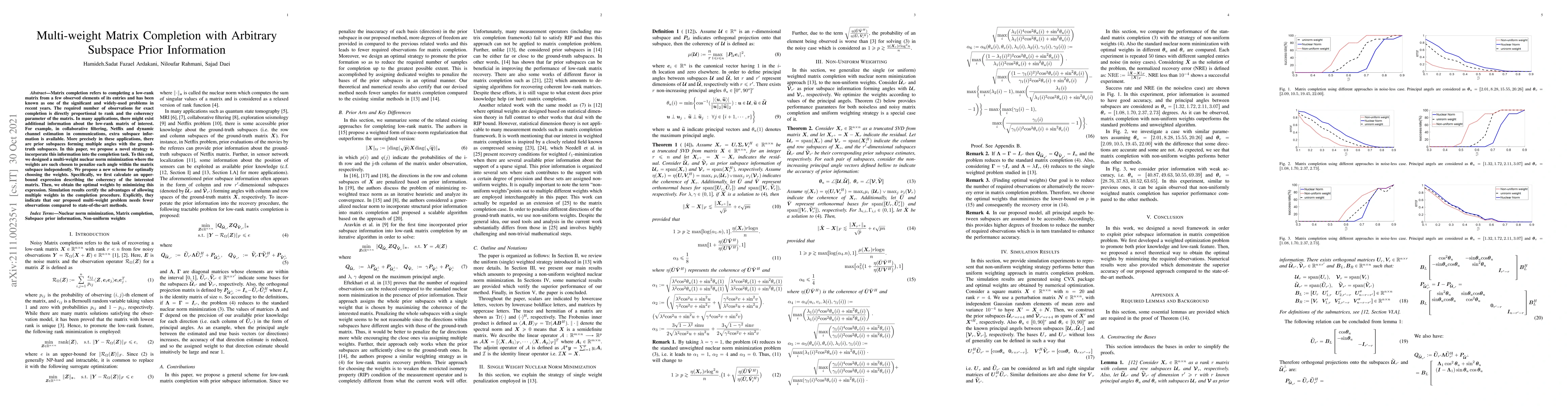 This paper proposes a novel multi-weight matrix completion method that utilizes prior subspace information to enhance the completion accuracy. The approach introduces a multi-weight nuclear norm minimization and determines optimal weights to minimize matrix coherency, resulting in fewer required observations compared to existing methods.