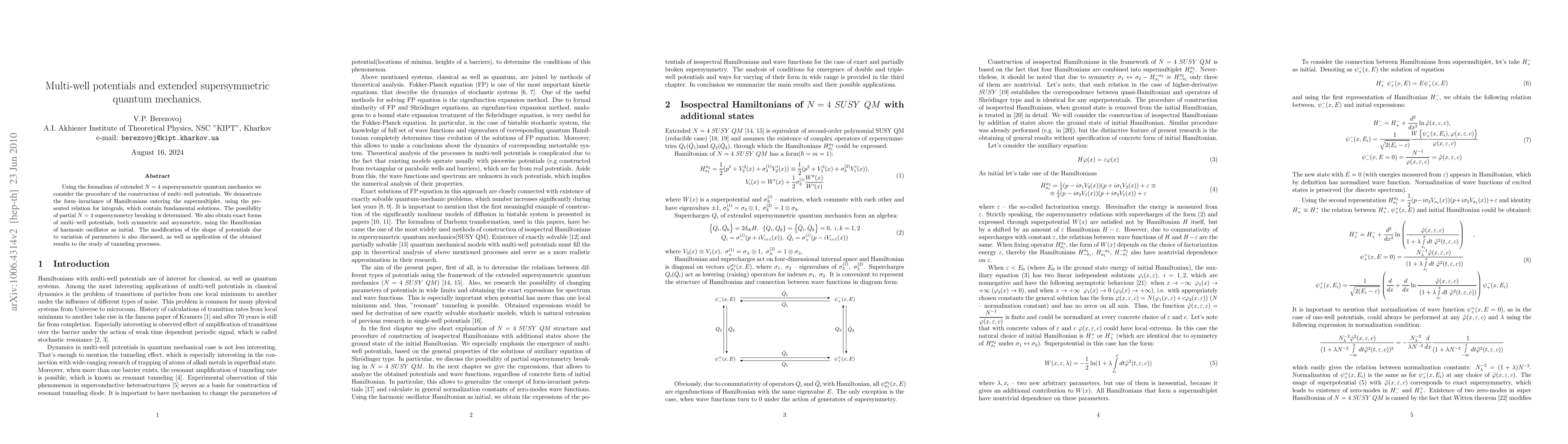 This paper constructs multi-well potentials using extended $N=4$ supersymmetric quantum mechanics, demonstrating form-invariance of Hamiltonians and exploring partial supersymmetry breaking. It derives exact forms of symmetric and asymmetric multi-well potentials, discusses shape modifications, and applies the results to tunneling processes.