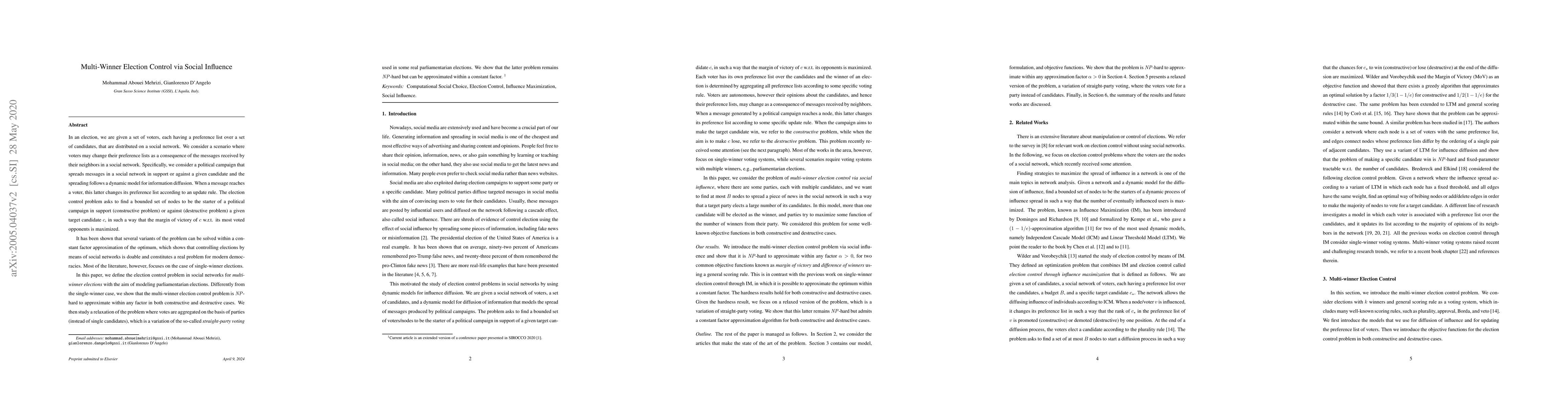 Researchers studied how social networks can influence elections, finding that controlling multi-winner elections is more complex than single-winner elections, but approximating solutions still possible.