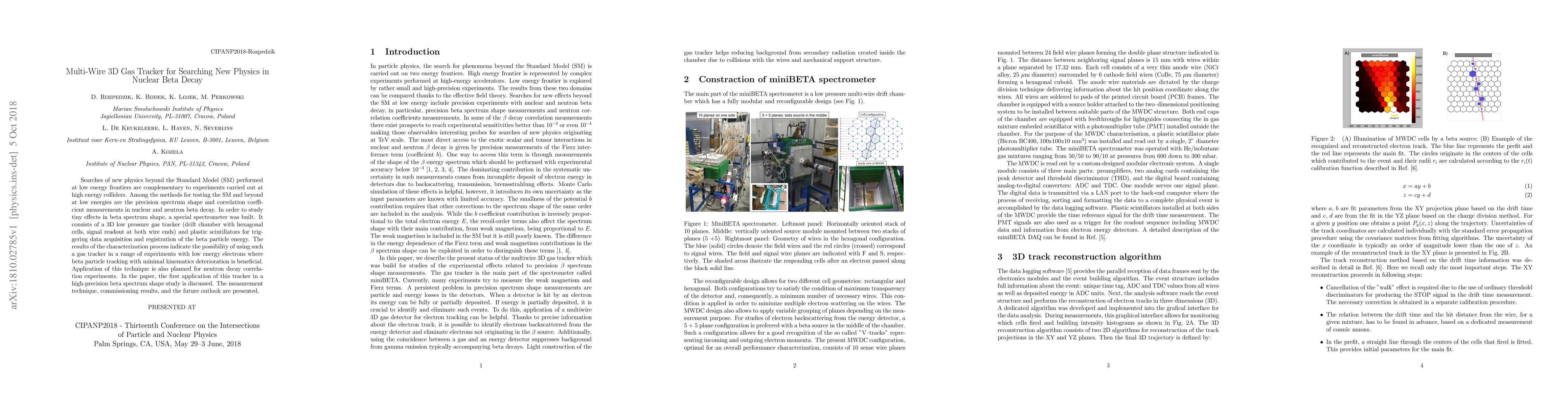 Searches of new physics beyond the Standard Model (SM) performed at low energy frontiers are complementary to experiments carried out at high energy colliders. Among the methods for testing the SM and beyond at low energies are the precision spectrum shape and correlation coefficient measurements in nuclear and neutron beta decay. In order to study tiny effects in beta spectrum shape, a special spectrometer was built. It consists of a 3D low pressure gas tracker (drift chamber with hexagonal cells, signal readout at both wire ends) and plastic scintillators for triggering data acquisition and registration of the beta particle energy. The results of the characterization process indicate the possibility of using such a gas tracker in a range of experiments with low energy electrons where beta particle tracking with minimal kinematics deterioration is beneficial. Application of this technique is also planned for neutron decay correlation experiments. In the paper, the first application of this tracker in a high-precision beta spectrum shape study is discussed. The measurement technique, commissioning results, and the future outlook are presented.