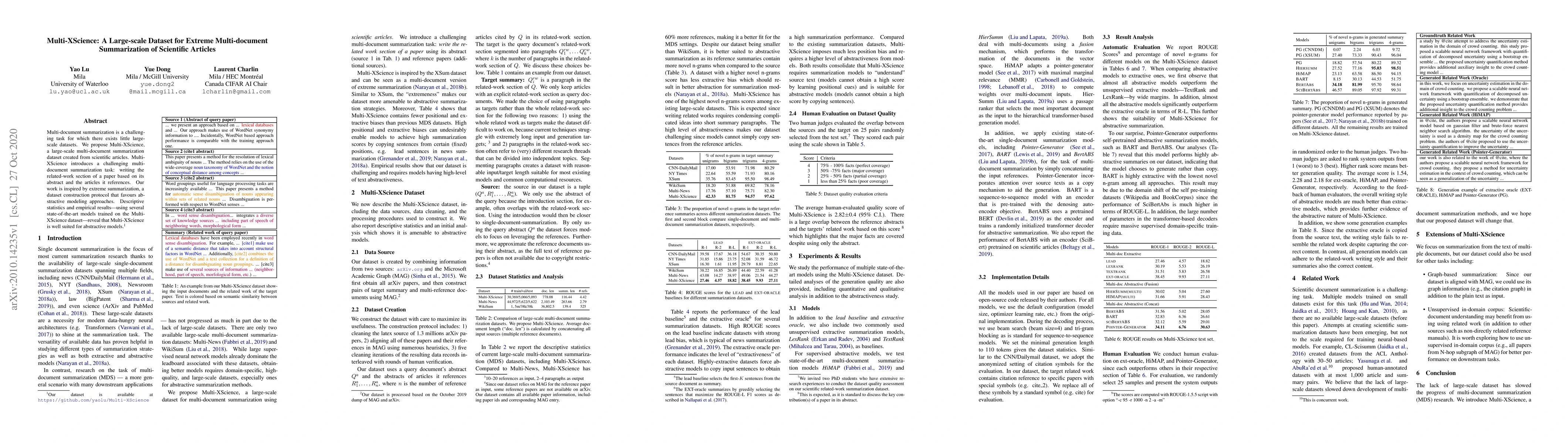 Multi-XScience is a large-scale dataset for extreme multi-document summarization of scientific articles, aimed at generating related-work sections. Preliminary results indicate it is ideal for abstractive summarization models.