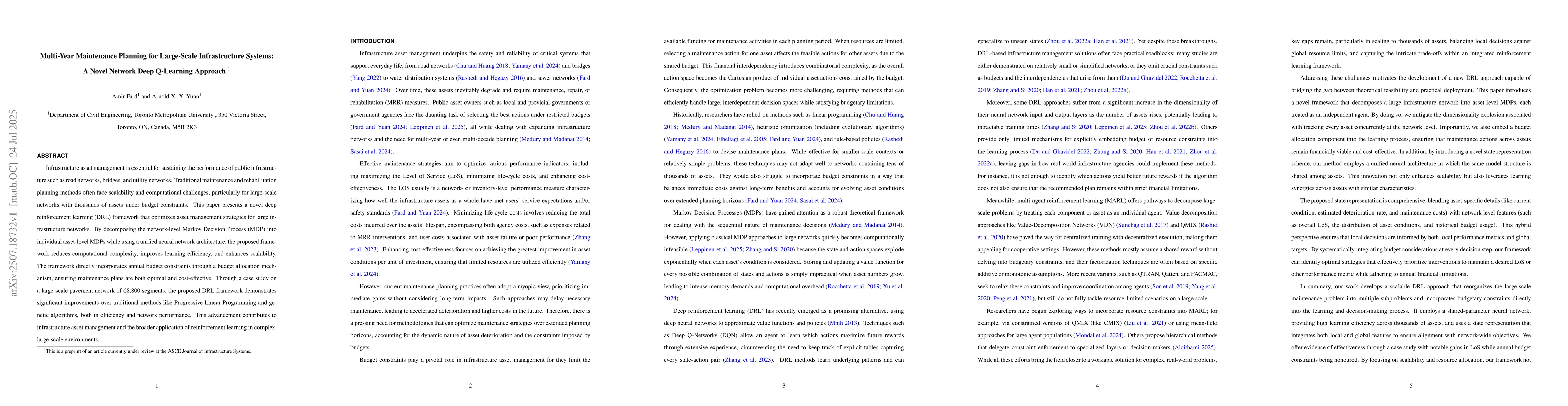 Infrastructure asset management is essential for sustaining the performance of public infrastructure such as road networks, bridges, and utility networks. Traditional maintenance and rehabilitation planning methods often face scalability and computational challenges, particularly for large-scale networks with thousands of assets under budget constraints. This paper presents a novel deep reinforcement learning (DRL) framework that optimizes asset management strategies for large infrastructure networks. By decomposing the network-level Markov Decision Process (MDP) into individual asset-level MDPs while using a unified neural network architecture, the proposed framework reduces computational complexity, improves learning efficiency, and enhances scalability. The framework directly incorporates annual budget constraints through a budget allocation mechanism, ensuring maintenance plans are both optimal and cost-effective. Through a case study on a large-scale pavement network of 68,800 segments, the proposed DRL framework demonstrates significant improvements over traditional methods like Progressive Linear Programming and genetic algorithms, both in efficiency and network performance. This advancement contributes to infrastructure asset management and the broader application of reinforcement learning in complex, large-scale environments.