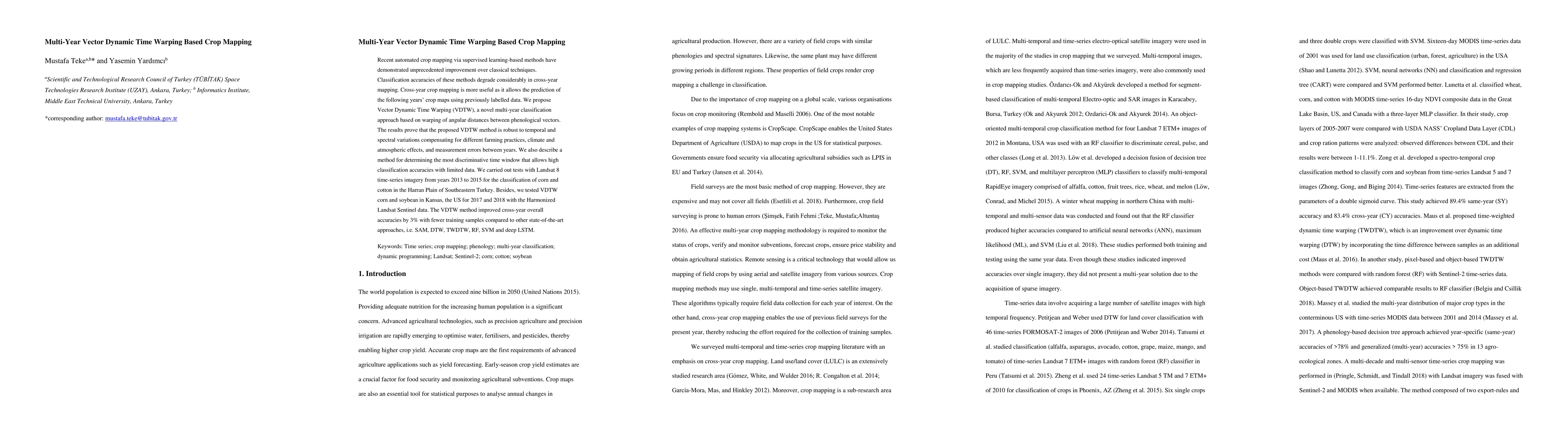 This paper proposes a Vector Dynamic Time Warping (VDTW) method for multi-year crop mapping, demonstrating robust performance in cross-year classification of corn, cotton, and soybean using Landsat imagery. The VDTW approach outperforms other state-of-the-art methods with high accuracy and fewer training samples.