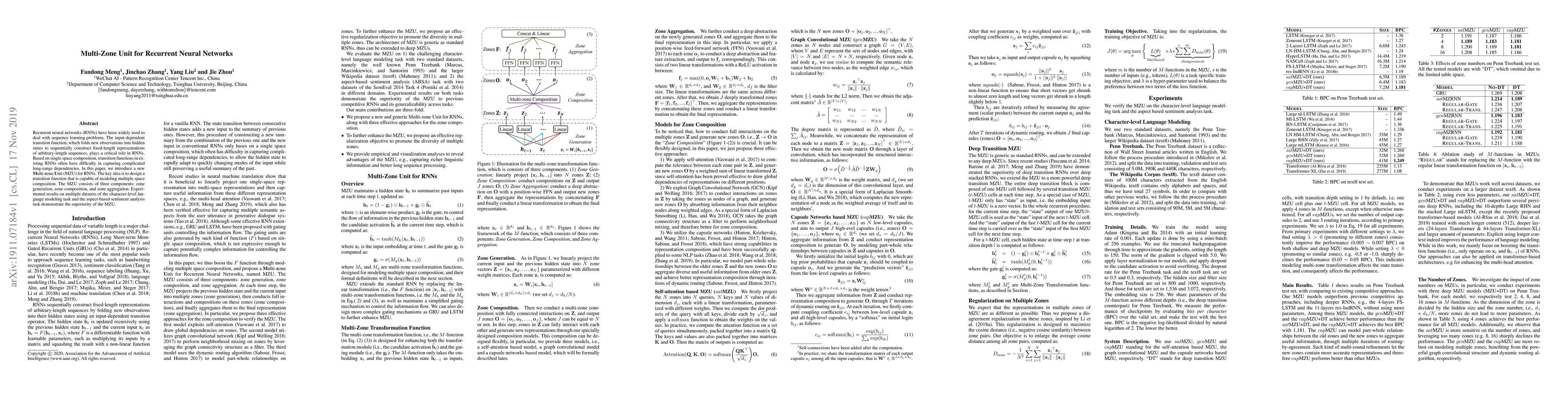 Recurrent neural networks (RNNs) have been widely used to deal with sequence learning problems. The input-dependent transition function, which folds new observations into hidden states to sequentially construct fixed-length representations of arbitrary-length sequences, plays a critical role in RNNs. Based on single space composition, transition functions in existing RNNs often have difficulty in capturing complicated long-range dependencies. In this paper, we introduce a new Multi-zone Unit (MZU) for RNNs. The key idea is to design a transition function that is capable of modeling multiple space composition. The MZU consists of three components: zone generation, zone composition, and zone aggregation. Experimental results on multiple datasets of the character-level language modeling task and the aspect-based sentiment analysis task demonstrate the superiority of the MZU.