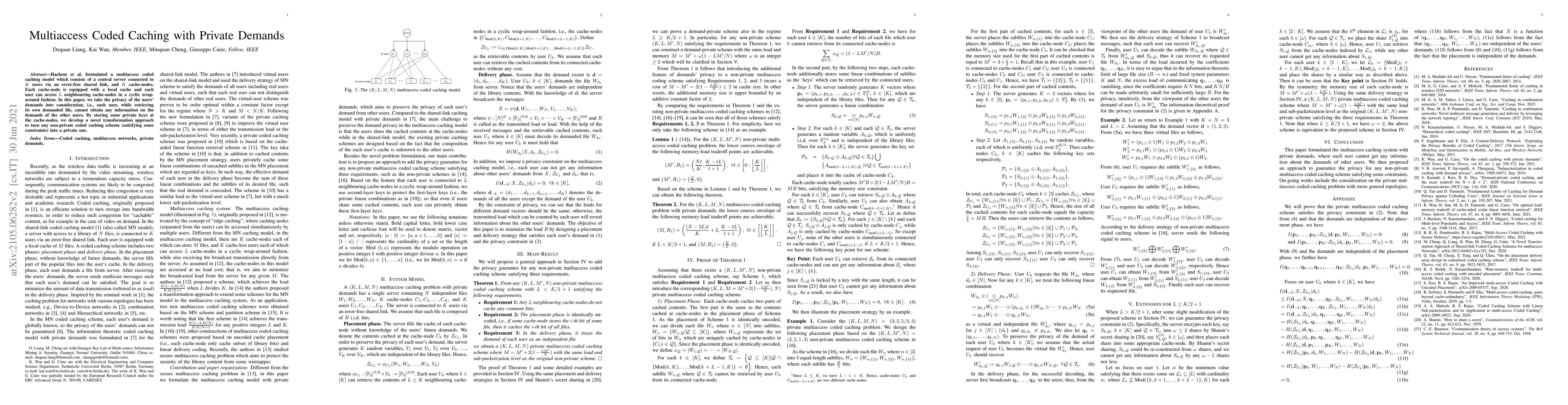 This paper introduces a privacy-preserving multiaccess coded caching model where each user can only access their required file without learning about others' demands. The authors propose a transformation method to convert non-private caching schemes into private ones by storing private keys at cache nodes.