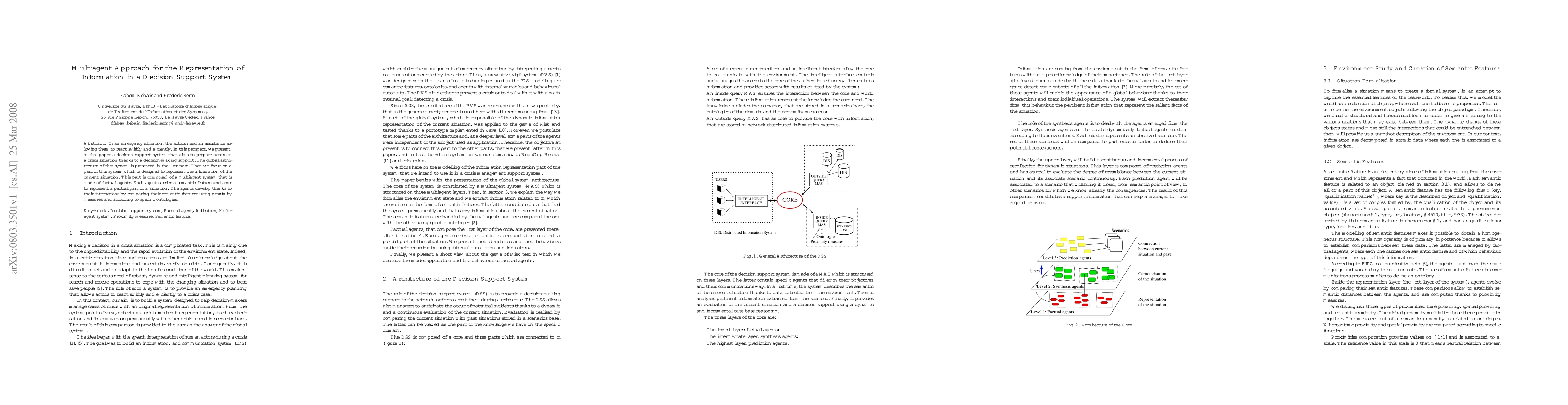 In an emergency situation, the actors need an assistance allowing them to react swiftly and efficiently. In this prospect, we present in this paper a decision support system that aims to prepare actors in a crisis situation thanks to a decision-making support. The global architecture of this system is presented in the first part. Then we focus on a part of this system which is designed to represent the information of the current situation. This part is composed of a multiagent system that is made of factual agents. Each agent carries a semantic feature and aims to represent a partial part of a situation. The agents develop thanks to their interactions by comparing their semantic features using proximity measures and according to specific ontologies.
