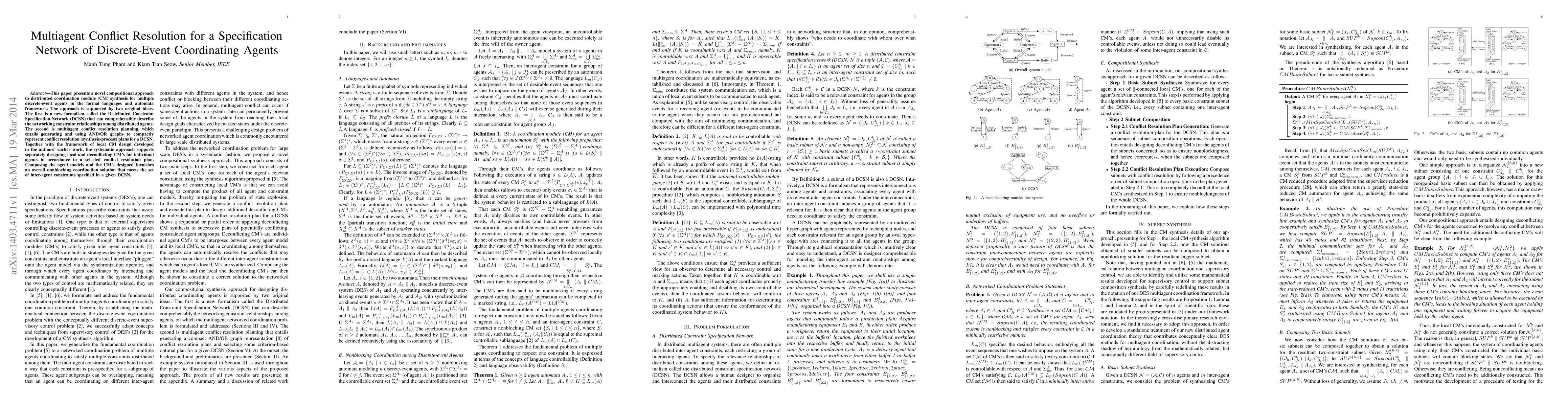 This paper presents a novel compositional approach to distributed coordination module (CM) synthesis for multiple discrete-event agents in the formal languages and automata framework. The approach is supported by two original ideas. The first is a new formalism called the Distributed Constraint Specification Network (DCSN) that can comprehensibly describe the networking constraint relationships among distributed agents. The second is multiagent conflict resolution planning, which entails generating and using AND/OR graphs to compactly represent conflict resolution (synthesis-process) plans for a DCSN. Together with the framework of local CM design developed in the authors' earlier work, the systematic approach supports separately designing local and deconflicting CM's for individual agents in accordance to a selected conflict resolution plan. Composing the agent models and the CM's designed furnishes an overall nonblocking coordination solution that meets the set of inter-agent constraints specified in a given DCSN.