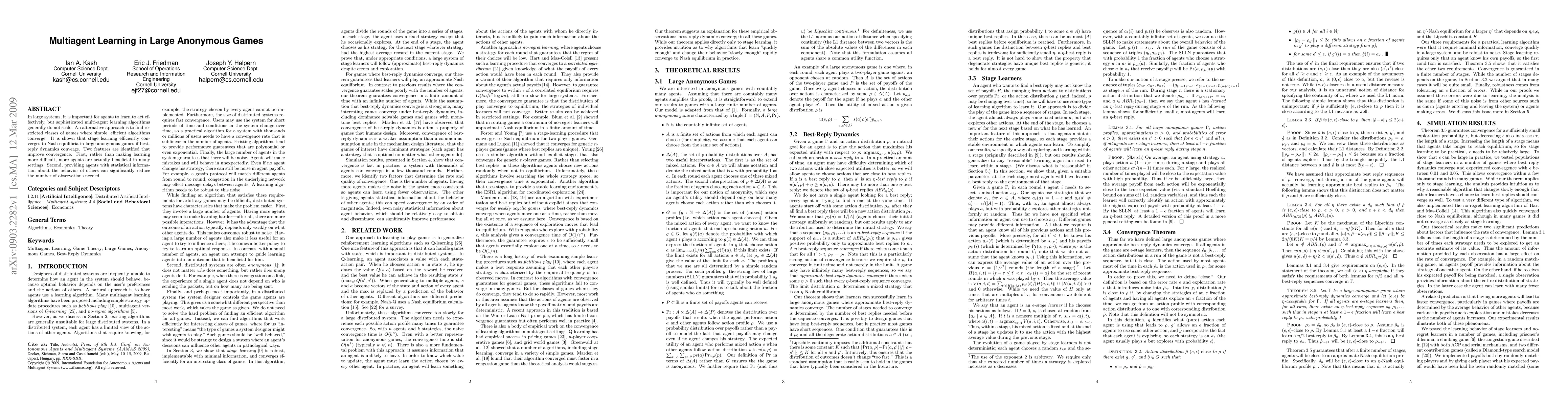 This paper explores multiagent learning in large anonymous games, demonstrating that stage learning converges to Nash equilibria when best-reply dynamics converge. It finds that more agents can enhance convergence and that statistical information about others' behavior can significantly reduce observation needs.