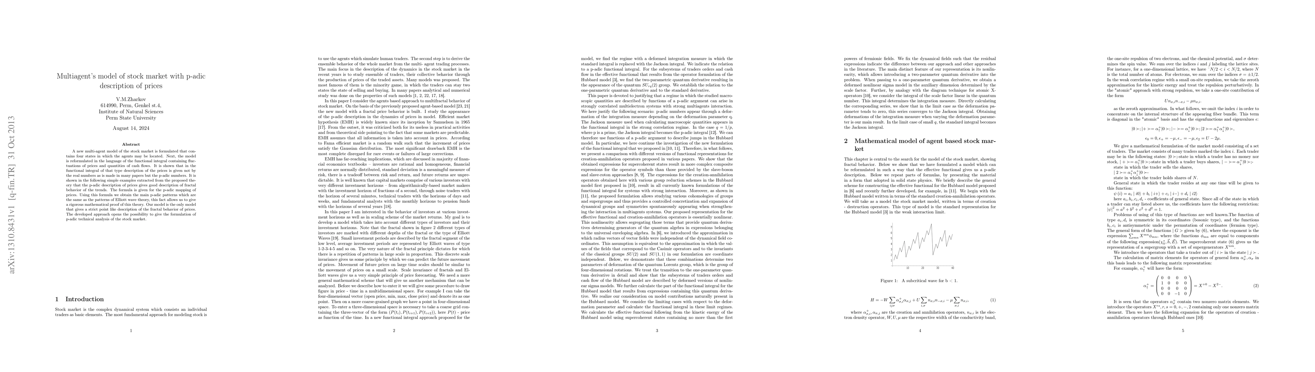 A new multiagent model of the stock market is formulated that contains four states in which the agents may be located. Next, the model is reformulated in the language of the functional integral containing fluctuations of prices and quantities of cash flows. It is shown that in the functional integral of that type description of the prices is given not by the real numbers as is made in many papers but the p-adic numbers. It is shown in the following simple examples extracted from the proposed theory that the p-adic description of prices gives good description of fractal behavior of the trends. The formula is given for the p-adic mapping of prices. Using this formula we obtain the main p-adic patterns which are the same as the patterns of Elliott wave theory, this fact allows us to give a rigorous mathematical proof of this theory. Our model is the only model that gives a strict point like description of the fractal behavior of prices. The developed approach opens the possibility to give the formulation of p-adic technical analysis of the stock market.