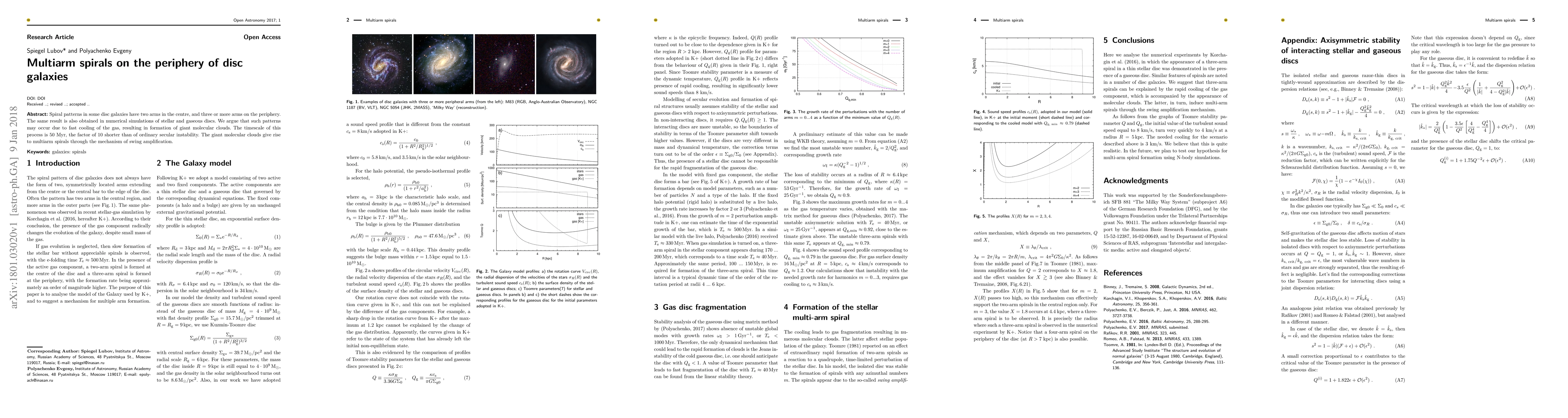 The research identifies a phenomenon of multiarm spirals in disc galaxies, with two central arms and multiple peripheral arms, supported by numerical simulations. This pattern is suggested to form due to rapid gas cooling leading to giant molecular clouds, a process faster than ordinary secular instability, amplified via swing amplification mechanism.